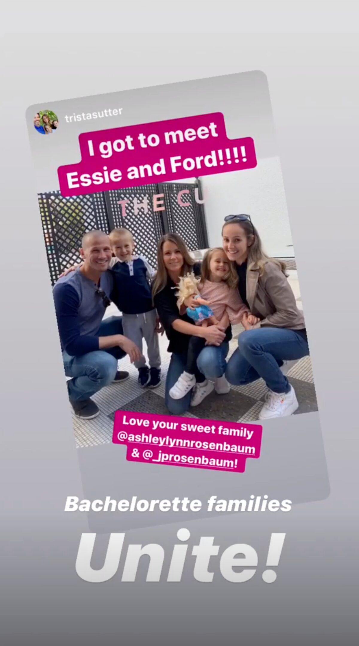 Both Trista and Ashley shared photos from their get-together on social media. Trista posted a picture of herself with Ashley, J.P., and their two children Fordham (Ford), 5, and Essex (Essie), 2. Essex turns 3 on November 5. Trista captioned the picture on her Instagram Story, “I got to meet Essie and Ford! Love your sweet family [Ashley and J.P.].”