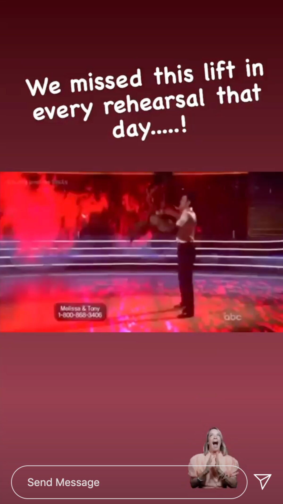 Also on Monday, after sharing some of her videos, she posted a throwback photo of the moment she found out she and Tony won Season 15. Tony jumps in the air and Melissa screams in delight. She captioned it, "Just because DWTS always makes me reminiscent. @tonydovolani - BEST. MOMENT. EVER. 🏆"