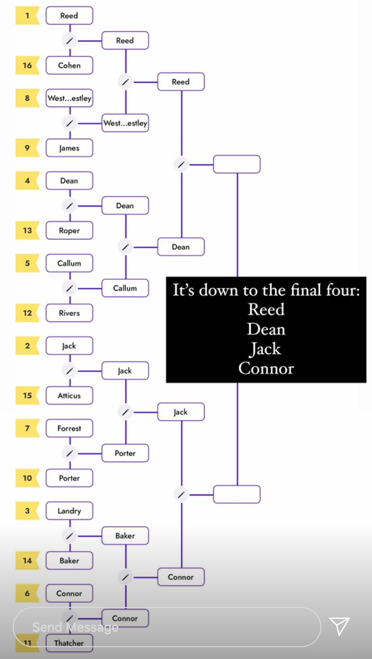 On Thursday, Jade shared on her Instagram Story that they were down to "the final four" names. After weeks of brackets and voting, the finalists consist of Reed, Dean, Jack, and Connor.