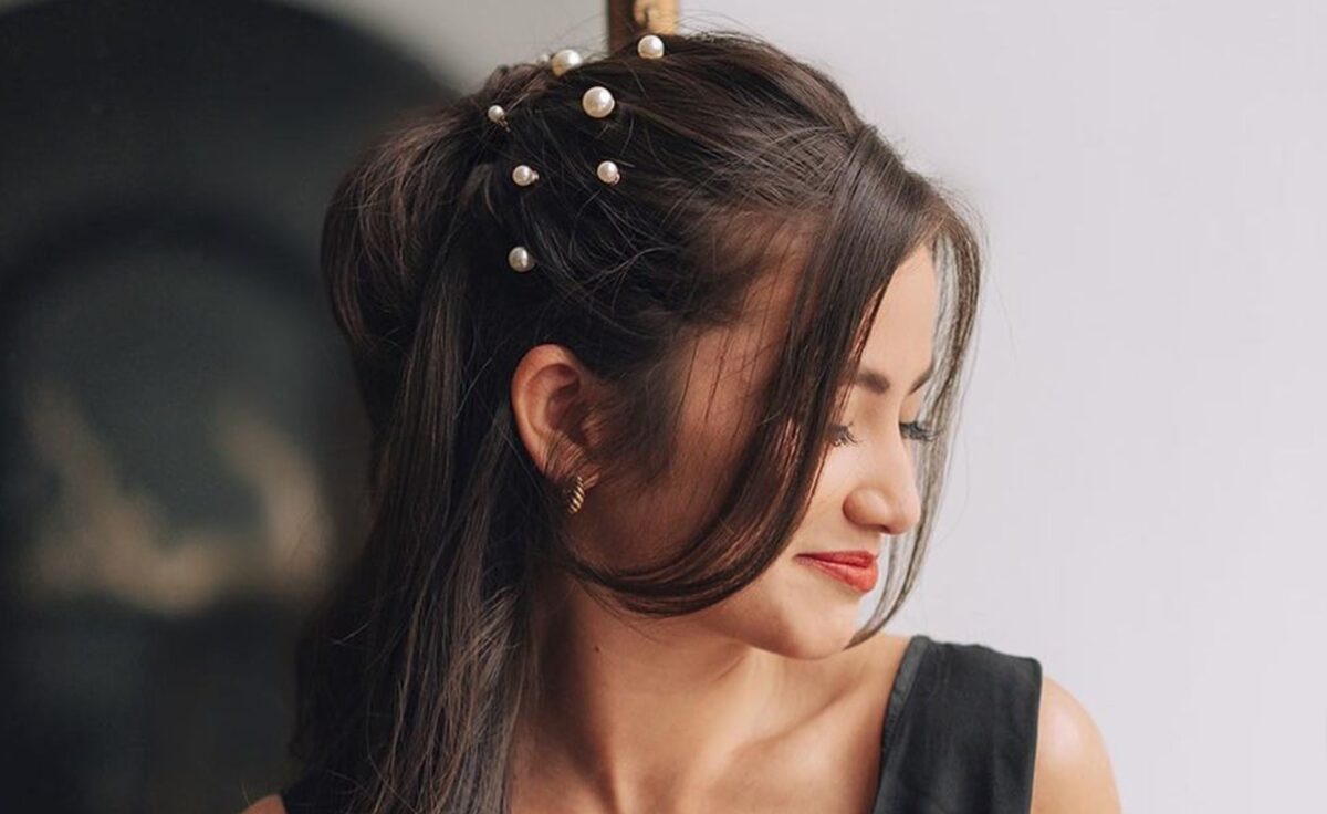 In a tutorial, Caila broke down the ’do — which involves a half-up ponytail embellished with shimmering peal twist pins — in several easy steps.