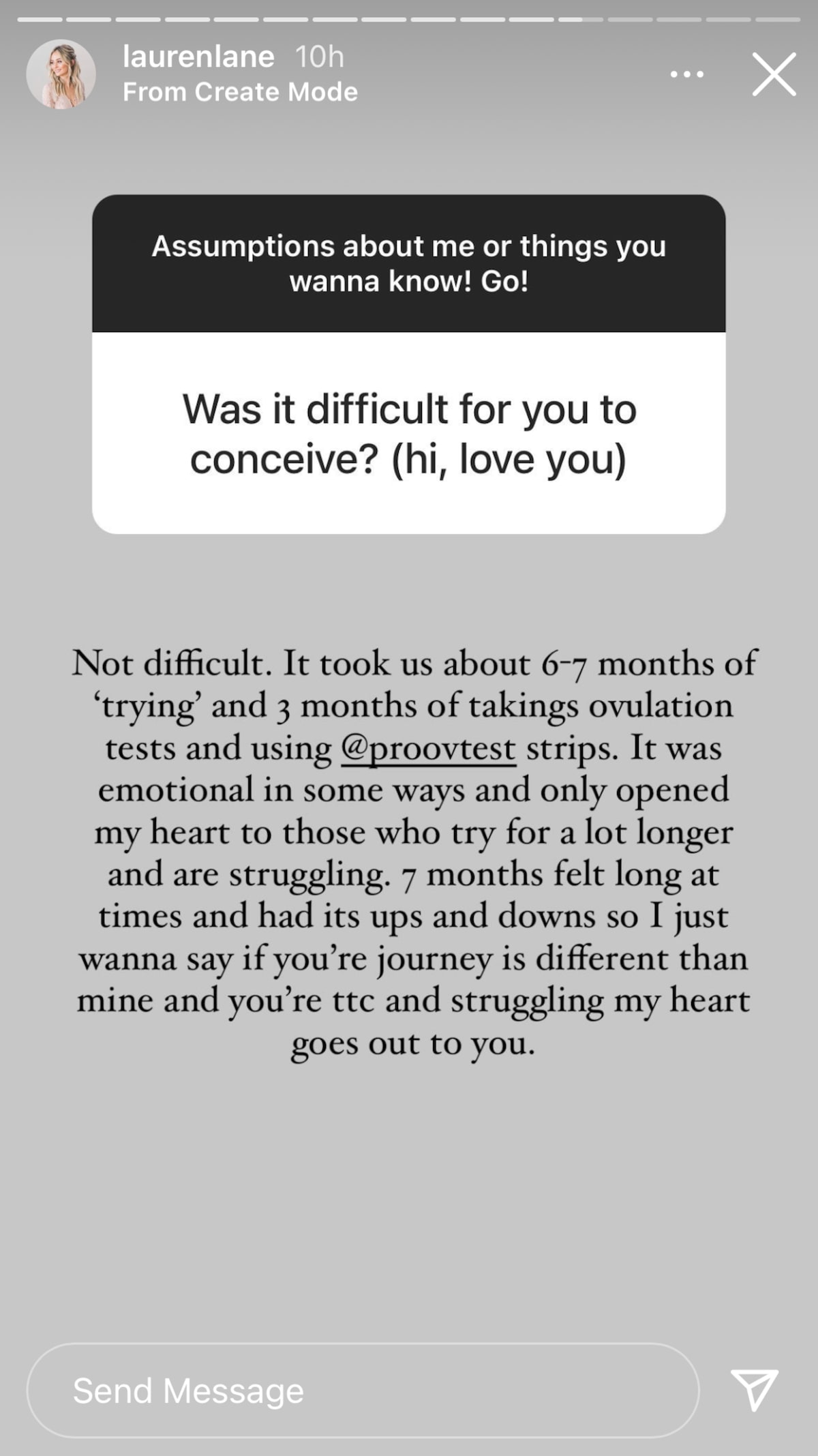 In response to a fan who asked if she had a tough time getting pregnant, the “Bachelor” Season 20 alum replied, “Not difficult. It took us about 6-7 months of ‘trying’ and 3 months of taking ovulation tests and using [Proov Test] strips.”
