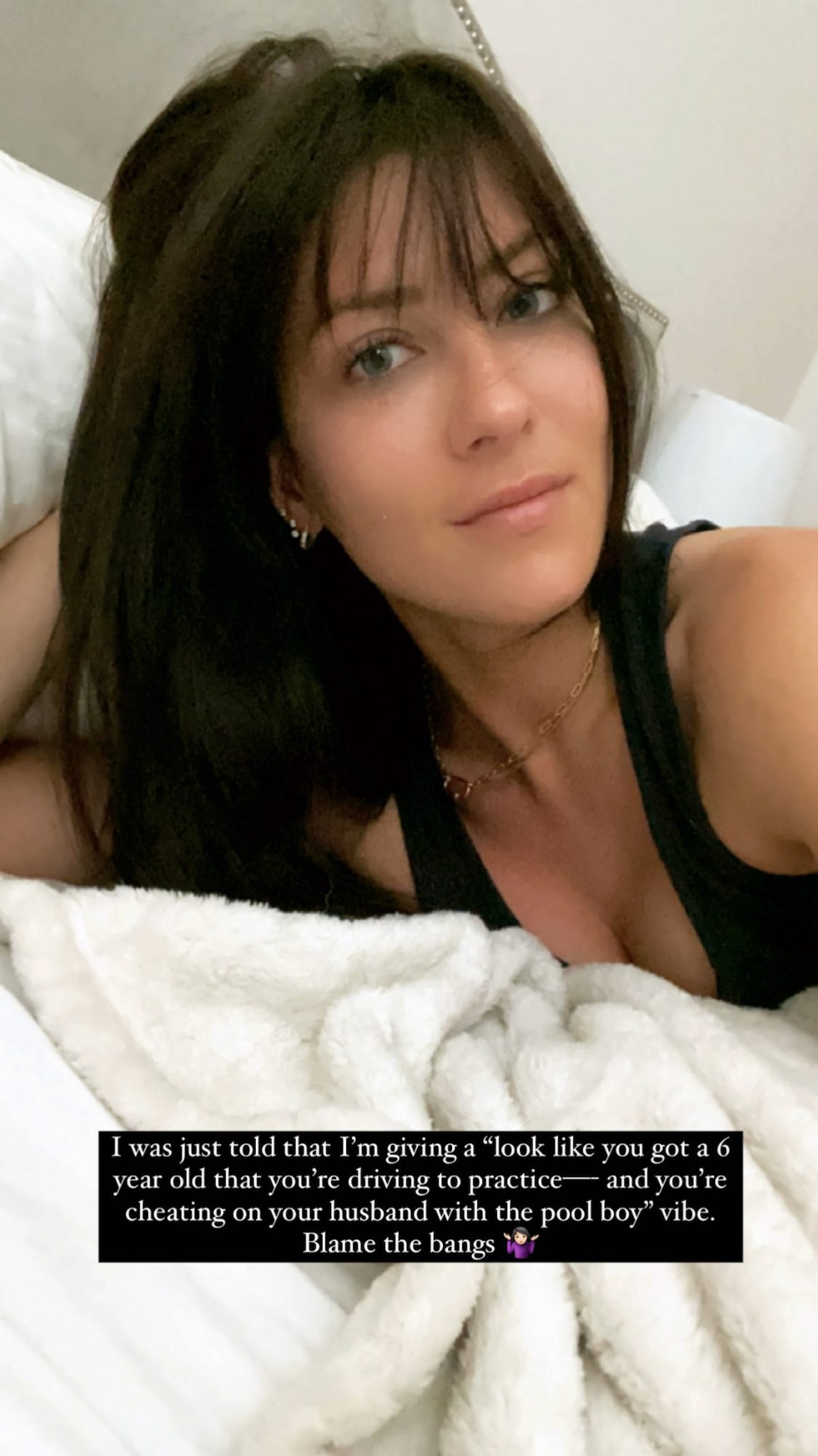 “I was just told that I’m giving a ‘look like you got a 6 year old that you’re driving to practice — and you’re cheating on your husband with the pool boy’ vibe,” wrote the Season 14 Bachelorette, who is known for her luscious brunette locks. “Blame the bangs.”