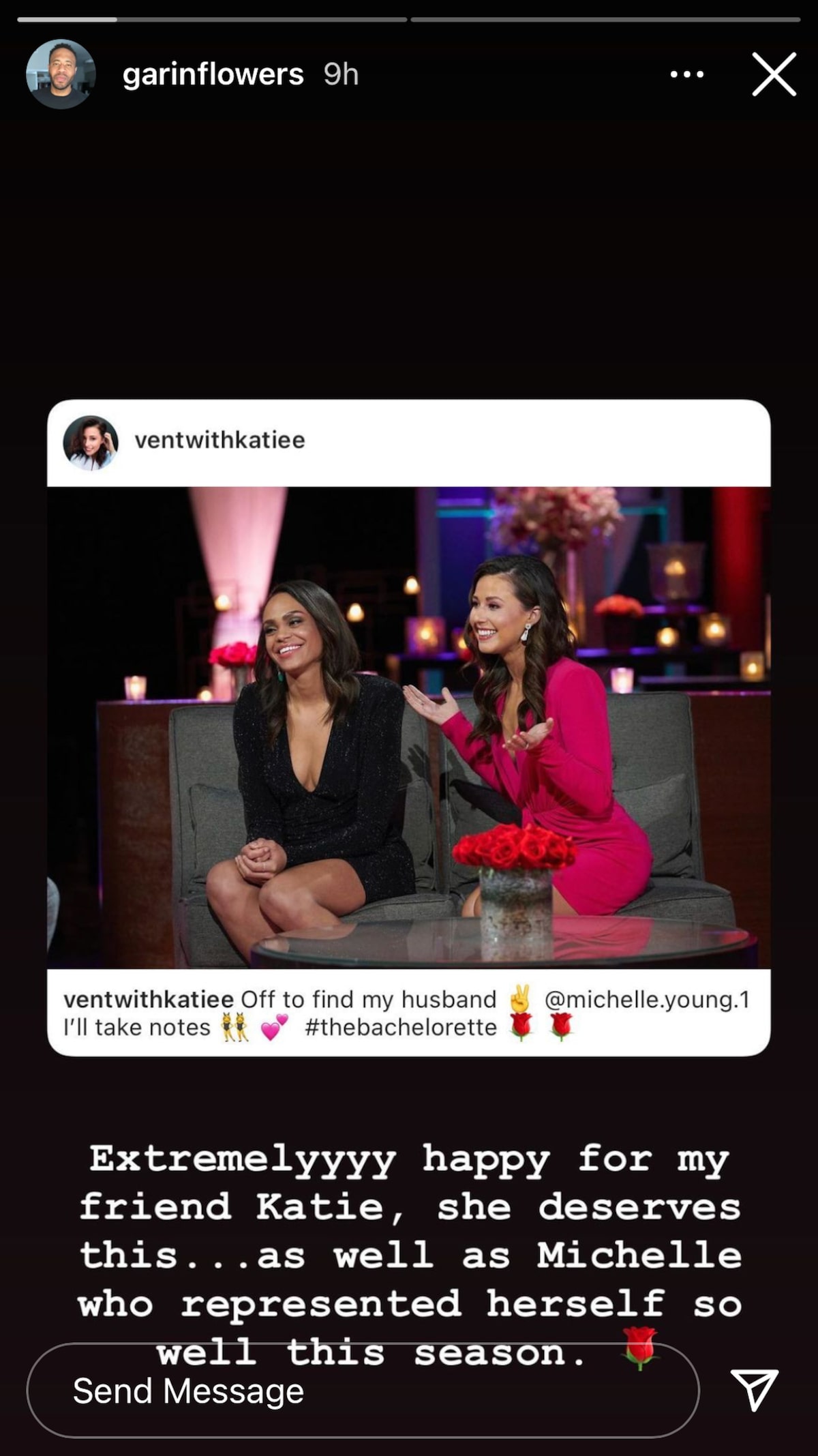 Meanwhile, “Bachelorette” Season 16 alum Garin Flowers lauded both women. “Extremelyyyy happy for my friend Katie,” he wrote. “She deserves this… as well as Michelle who represented herself so well this season.”