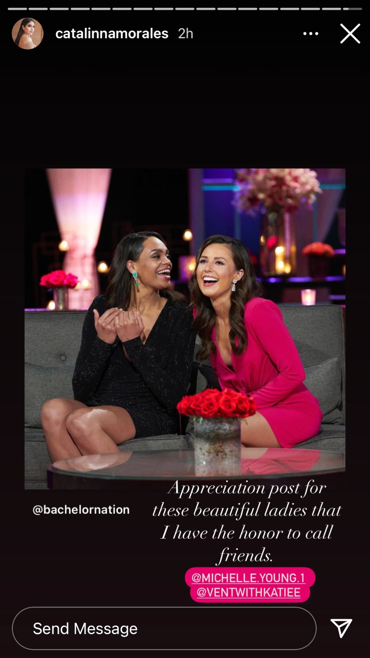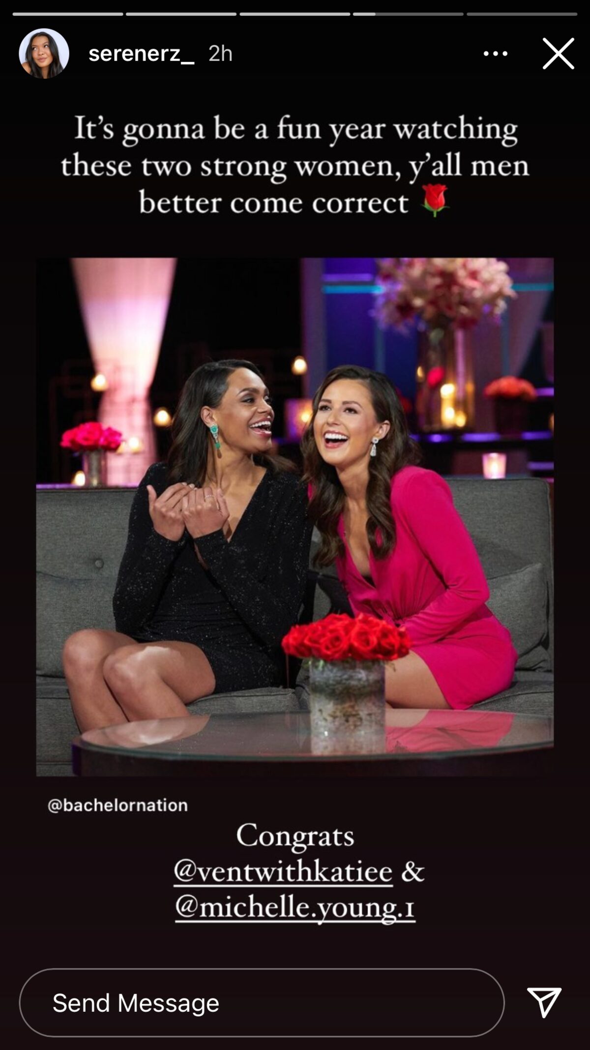 Despite her on-camera spat with Katie, fellow “Bachelor” Season 25 star Serena Chew sent her well wishes to each Bachelorette. “It’s gonna be a fun year watching these two strong women,” she gushed. “Y’all men better come correct. Congrats @ventwithkatiee & @michelle.young.1.”