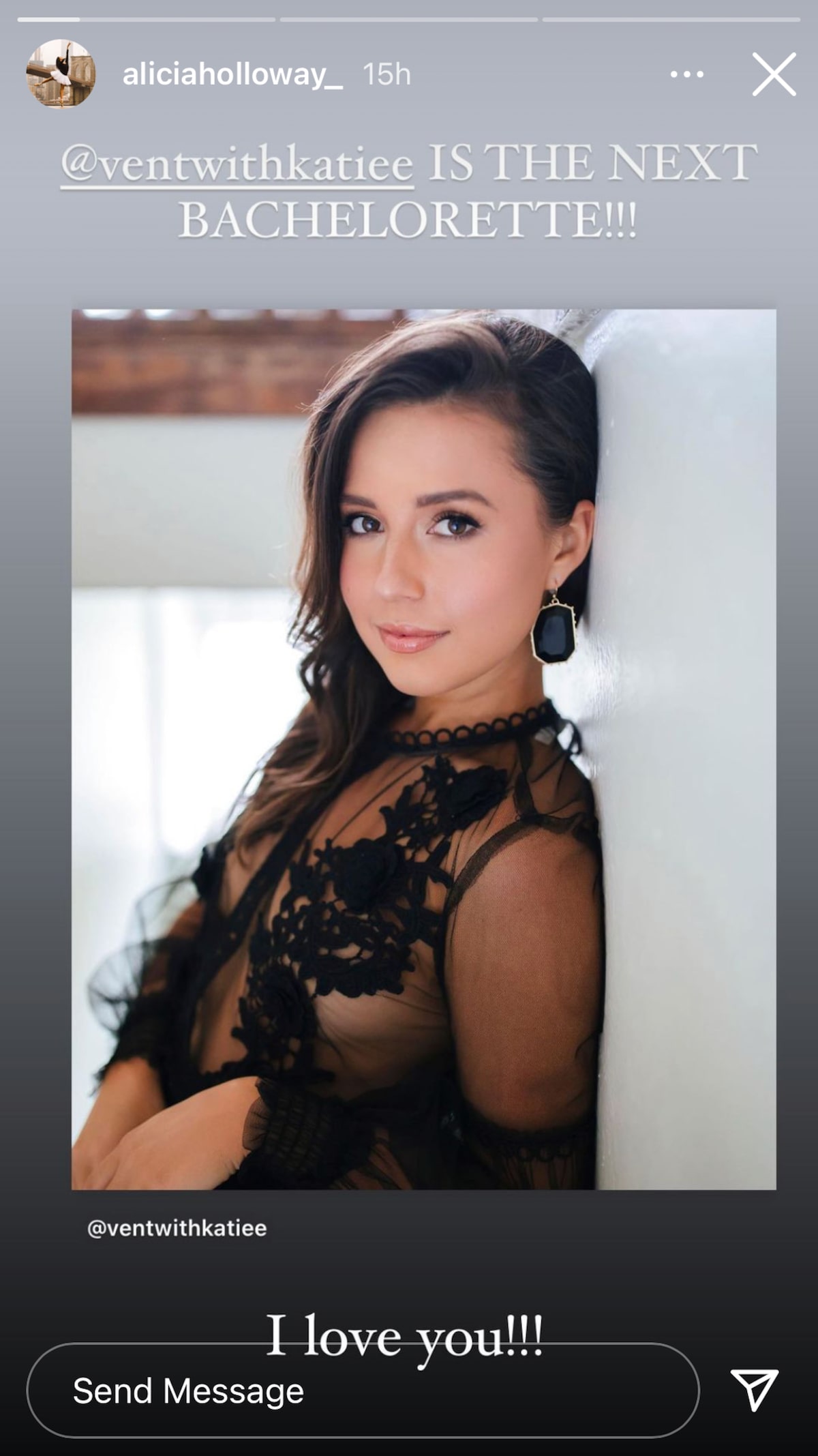 Alicia Holloway also expressed support for her pal Katie. “@ventwithkatiee IS THE NEXT BACHELORETTE!!!!” she wrote. “I love you!!!”