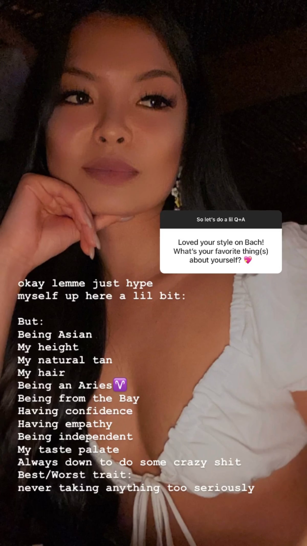 The San Francisco native then listed a series of personal traits she finds particularly attractive. “Being Asian, my height, my natural tan, my hair, being an Aries, being from the Bay, having confidence,” she wrote.