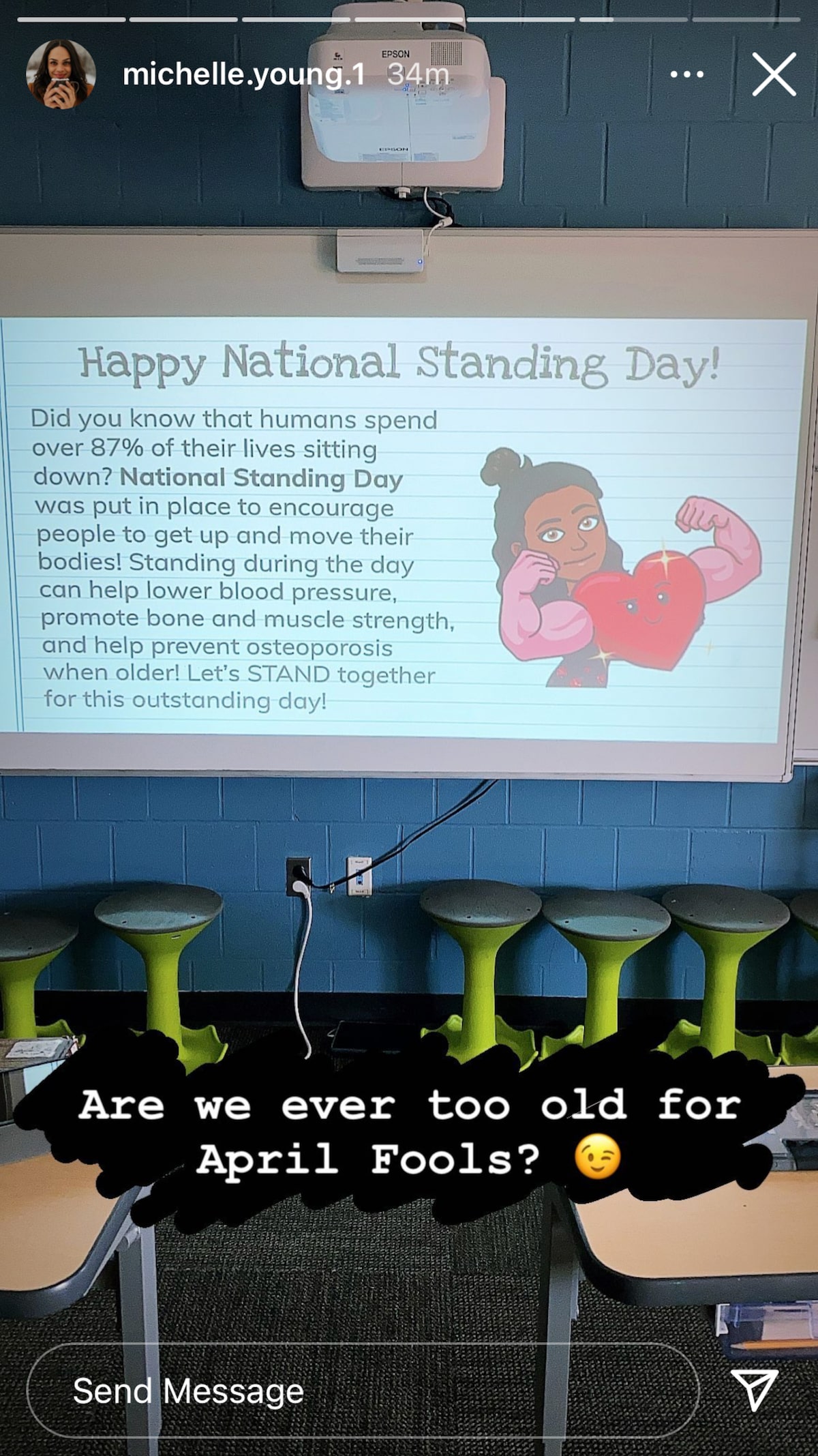 “Did you know that humans spend 87% of their lives sitting down? National Standing Day was put in place to encourage people to get up and move their bodies!” Michelle’s message read. “Standing during the day can help lower blood pressure, promote bone and muscle strength, and help prevent osteoporosis when older. Let’s STAND together for this outstanding day!”
