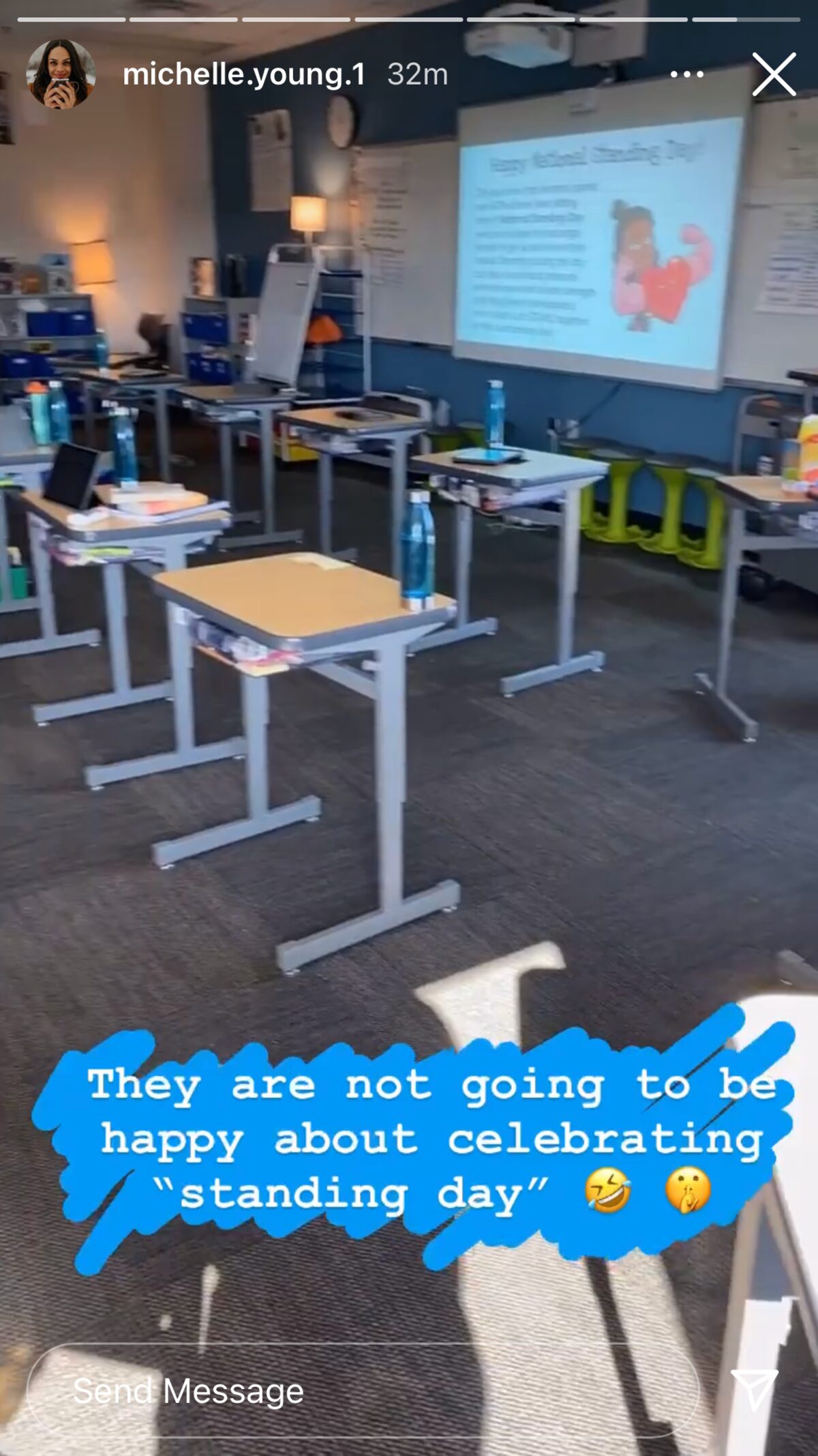 Elsewhere, Michelle posted video footage of her classroom showing clusters of desks without any chairs to take a seat while learning. “They are not going to be happy about celebrating ‘standing day,’” she added.