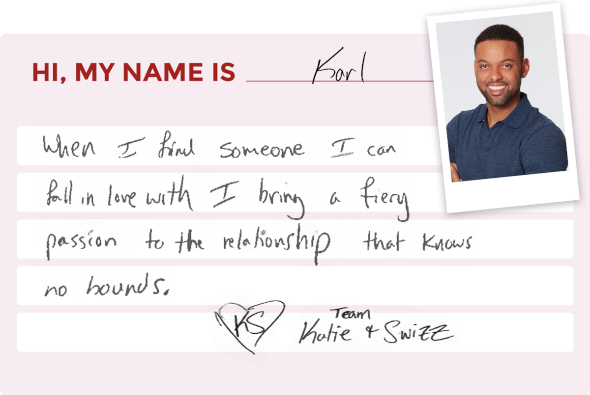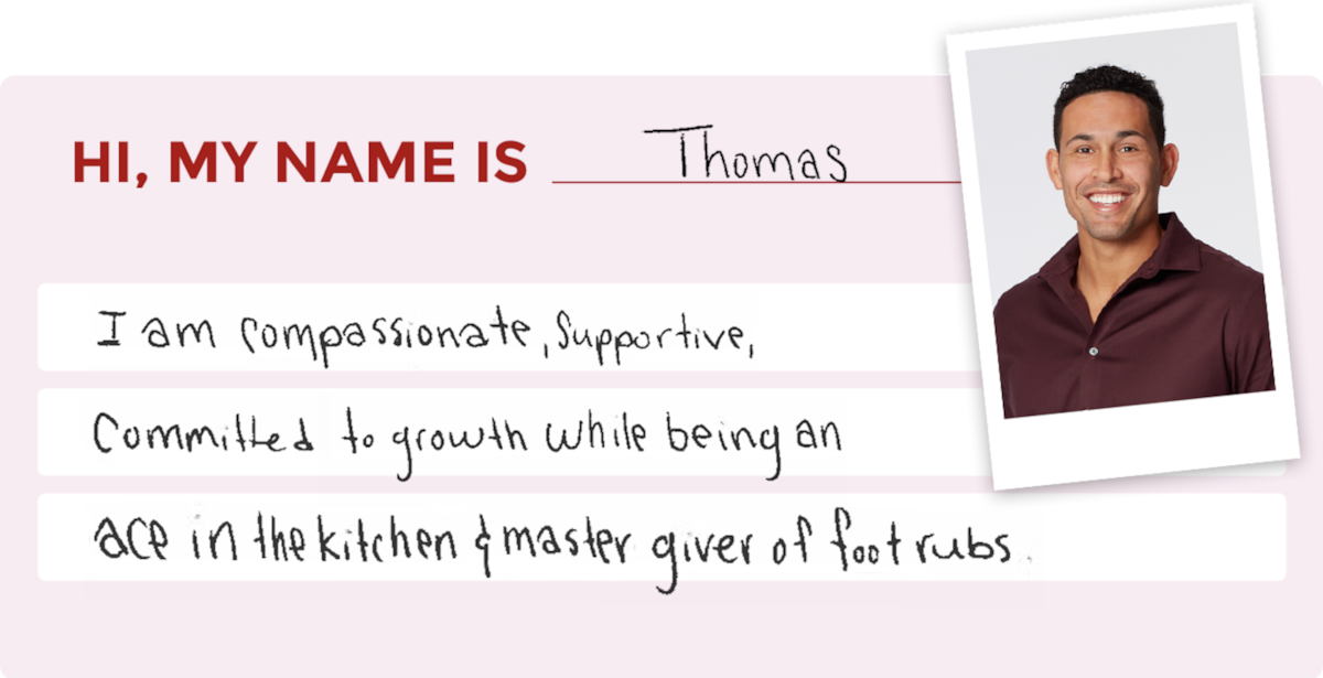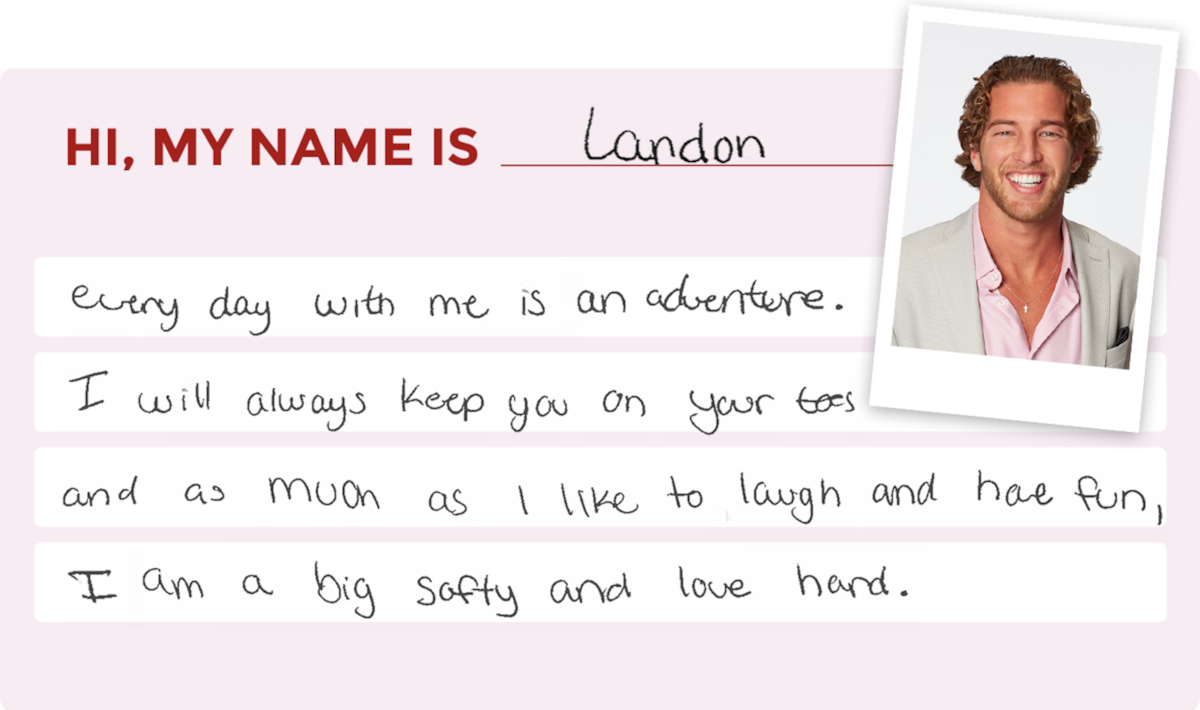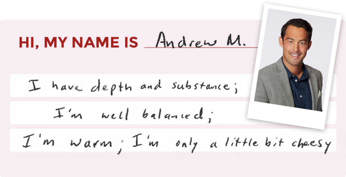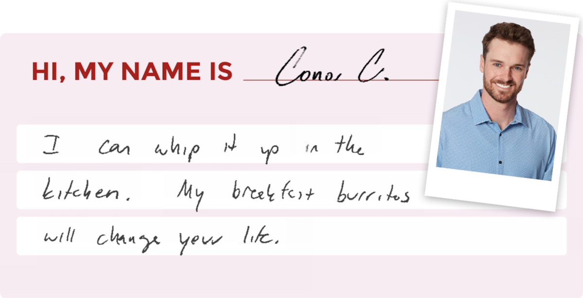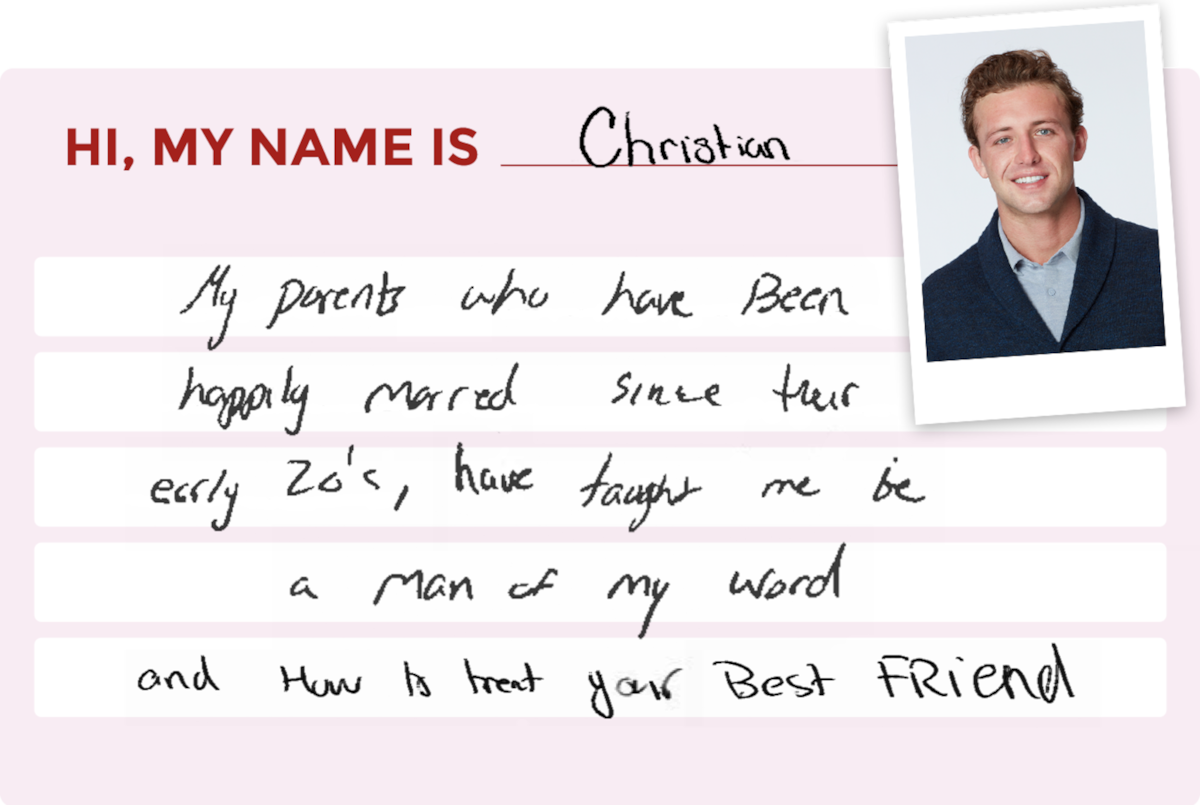 In handwritten notes, contestants Andrew M., Christian, Conor C., Karl, Landon, and Thomas introduce themselves as they respond to the following prompt: “I’m a catch because…”