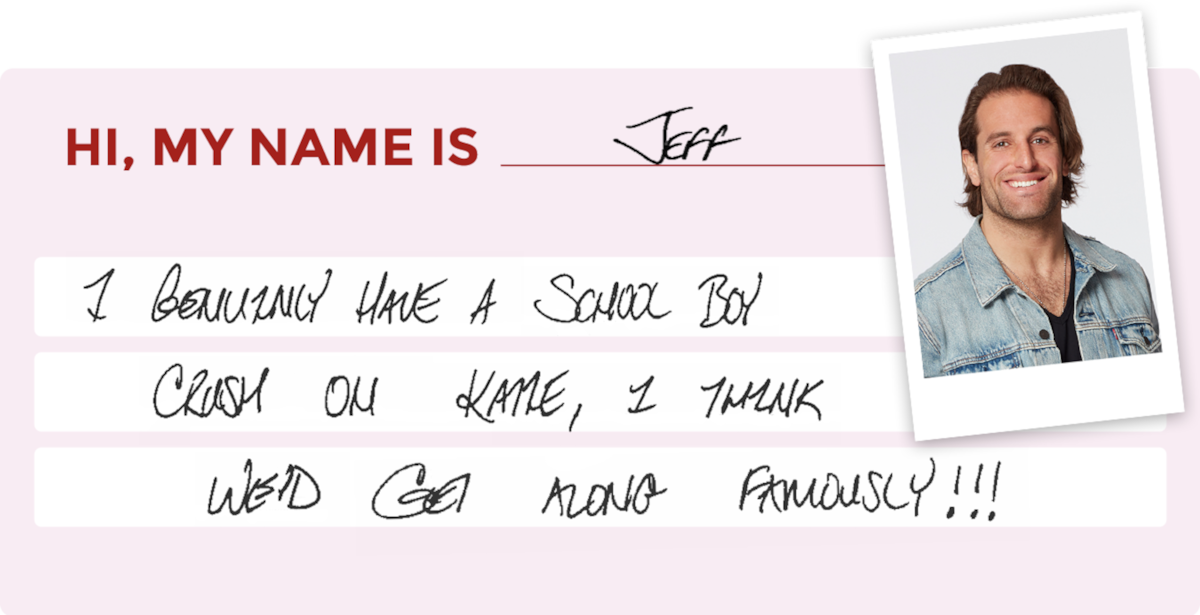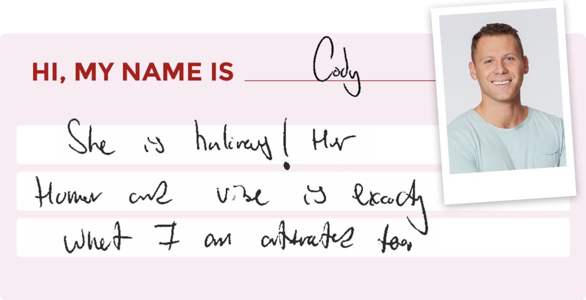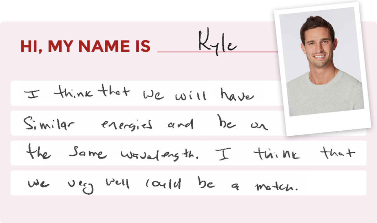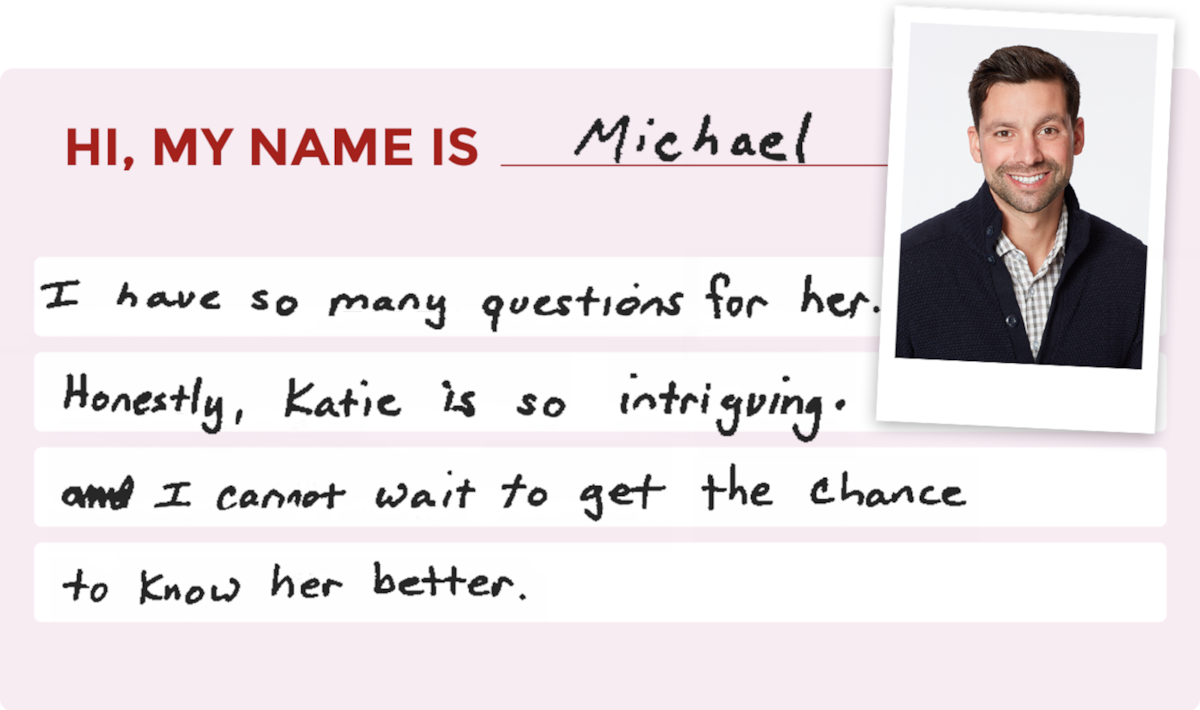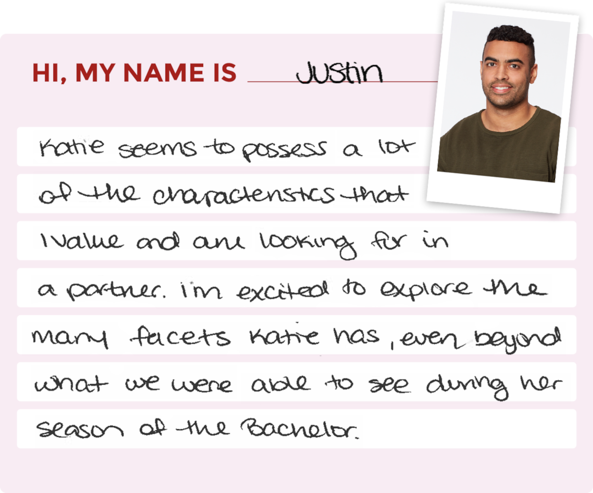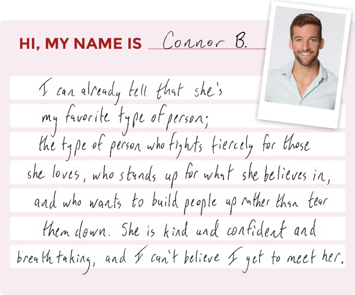 In handwritten notes, contestants Cody, Connor B., Jeff, Justin, Kyle, and Michael A. introduce themselves as they respond to the following prompt: “I can’t wait to meet the Bachelorette because…”