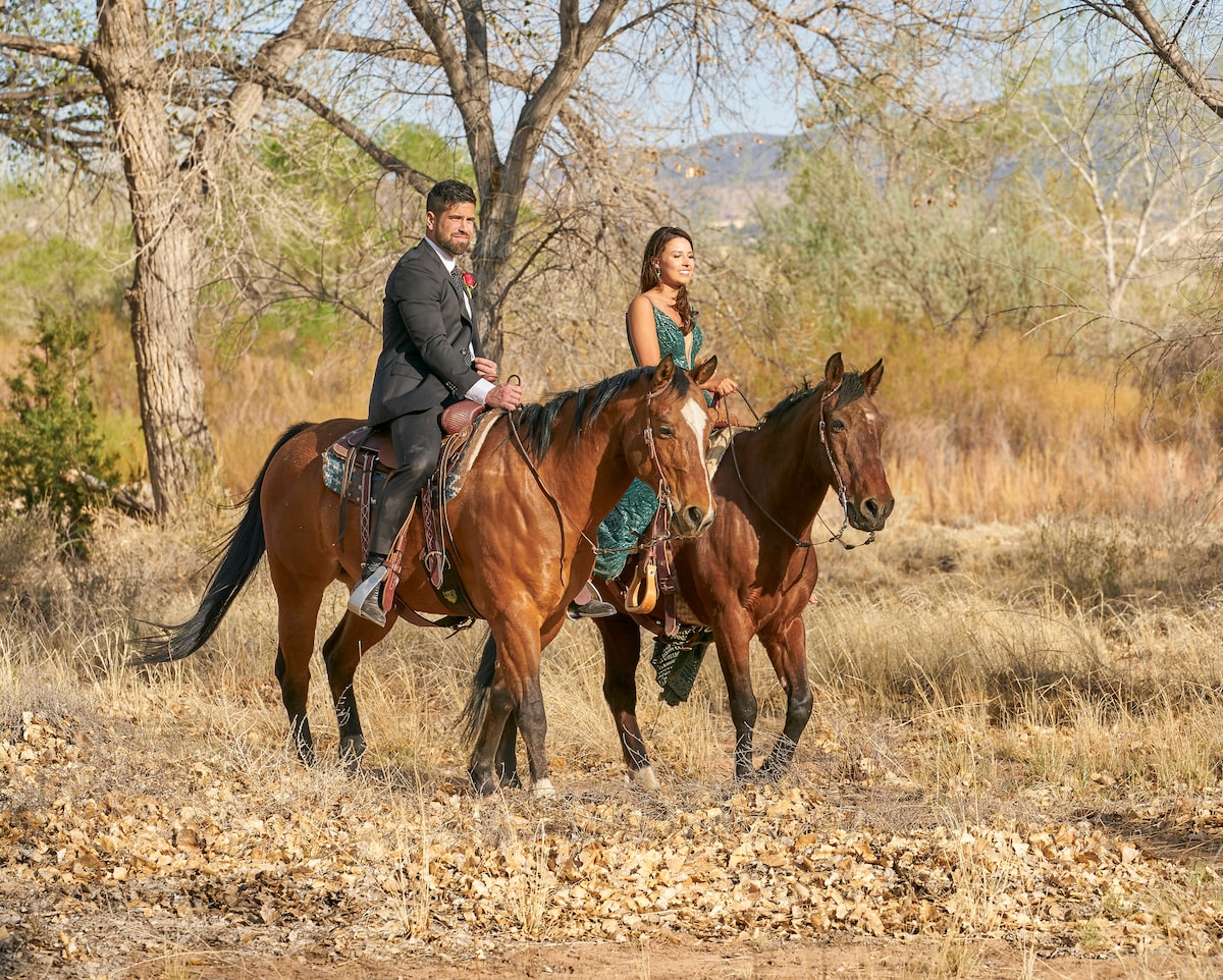 After co-hosts Tayshia and Kaitlyn Bristowe congratulated Katie and Blake, the couple hopped on a pair of horses and literally rode off into the sunset, happily ever after.