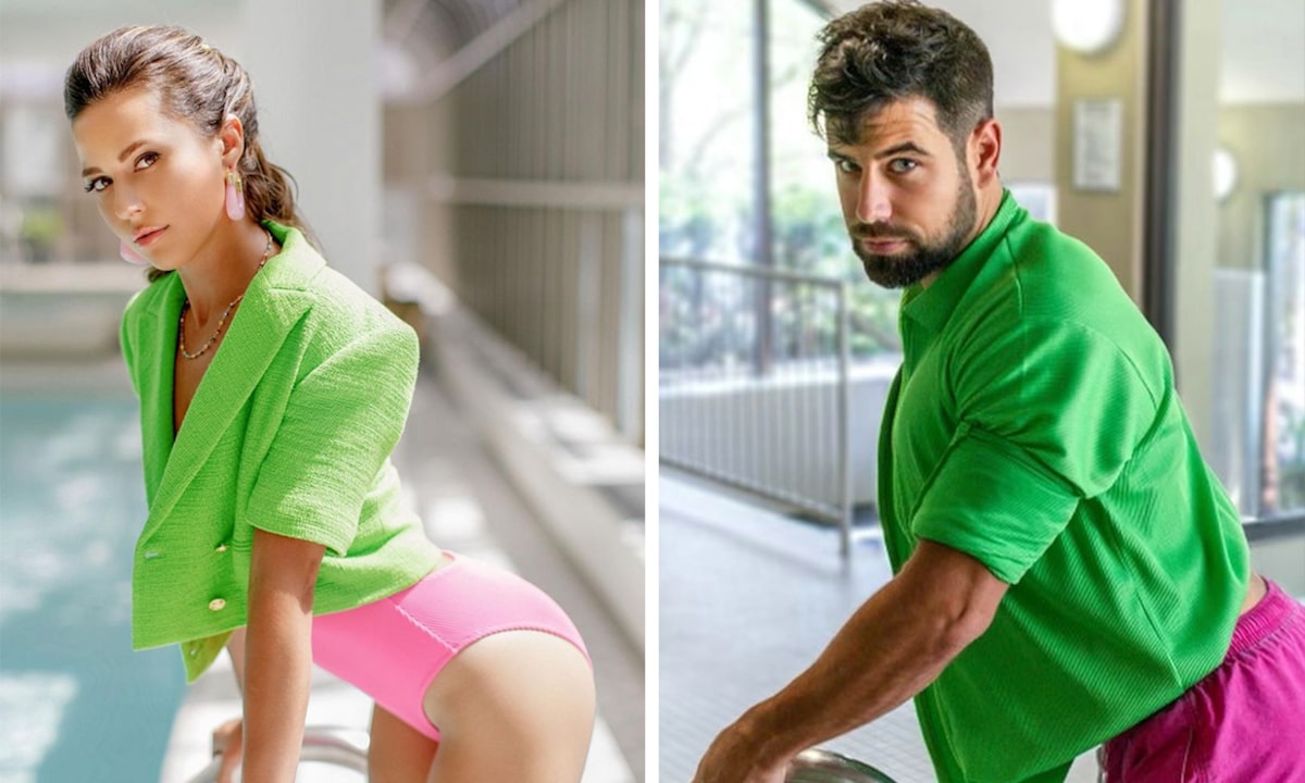In a series of photos, Blake also mimics Katie’s sizzling hot look and sensual poses. Rather than a pink one-piece and lime jacket, though, the handsome wildlife manager wears bubblegum trunks paired with a green button-down shirt left open to expose his fit physique.