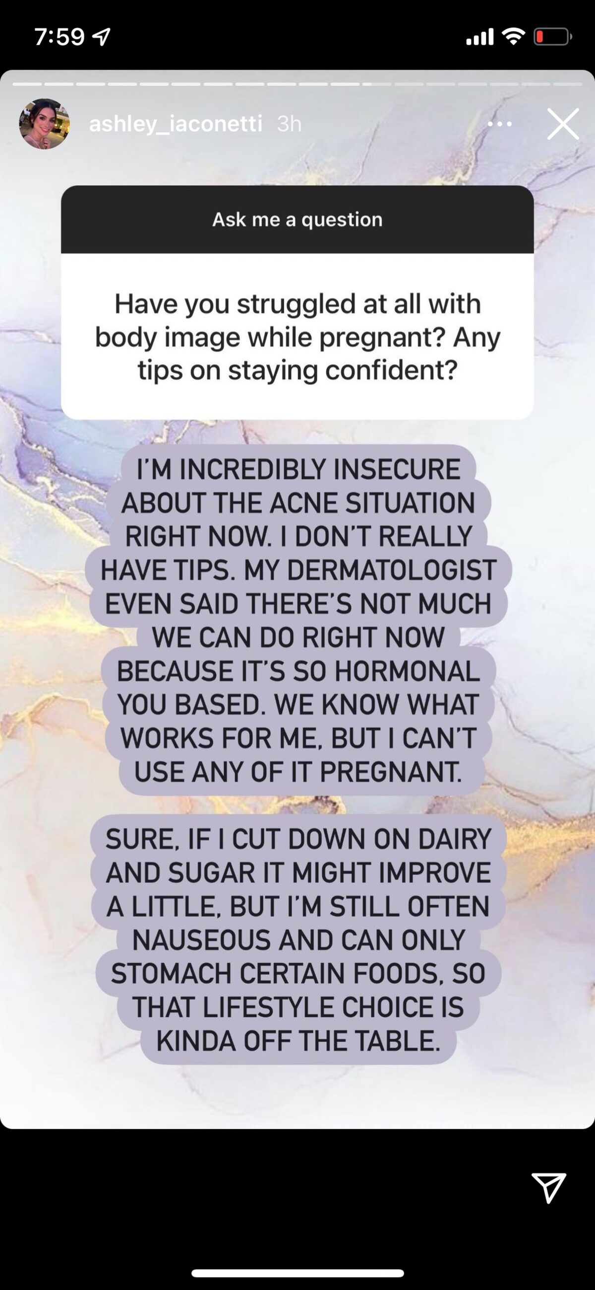 “I’m incredibly insecure about my acne situation right now. I don’t really have tips. My dermatologist even said there’s not much we can do right now because it’s so hormonal based. We know what works for me, but I can’t use any of it pregnant,” Ashley explained.