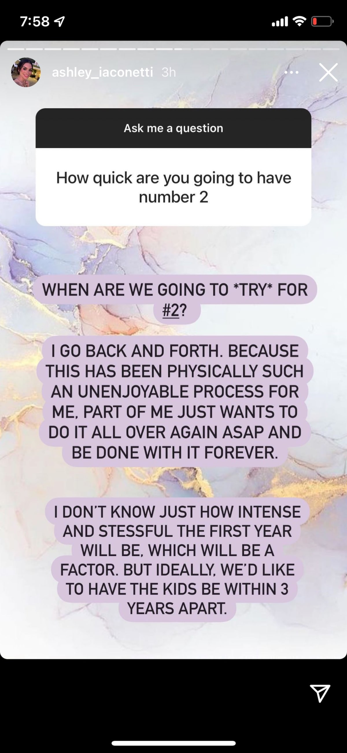 Ashley responded candidly, saying, “I go back and forth because this has been physically such an unenjoyable process for me. Part of me just wants to do it all over again ASAP and be done with it forever.”