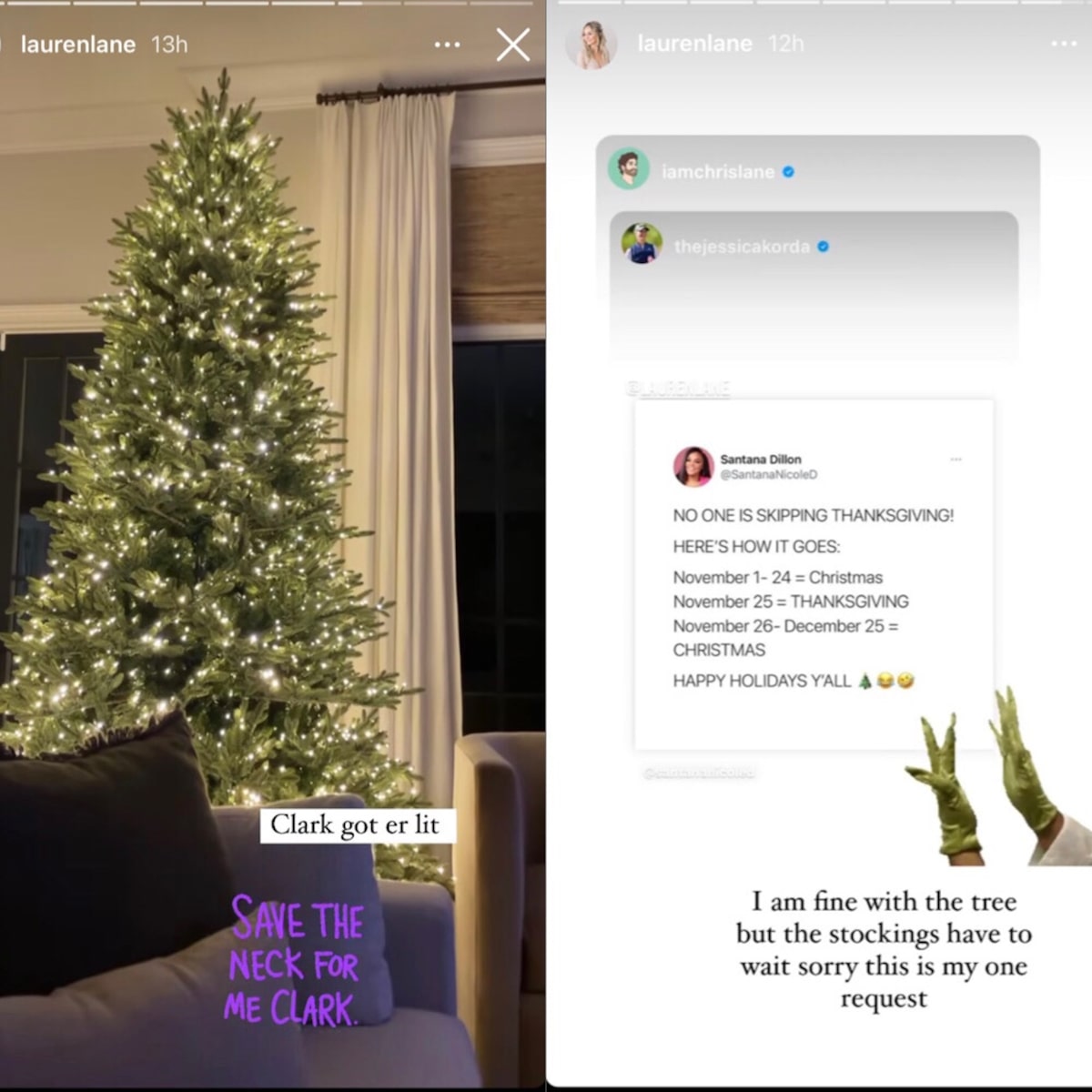 Her husband hilariously shared a meme that says “No one is skipping Thanksgiving! Here’s how it goes: November 1 - 24 = Christmas, November 25 = Thanksgiving, November 26 - December 25 = Christmas. Happy Holidays y’all!”