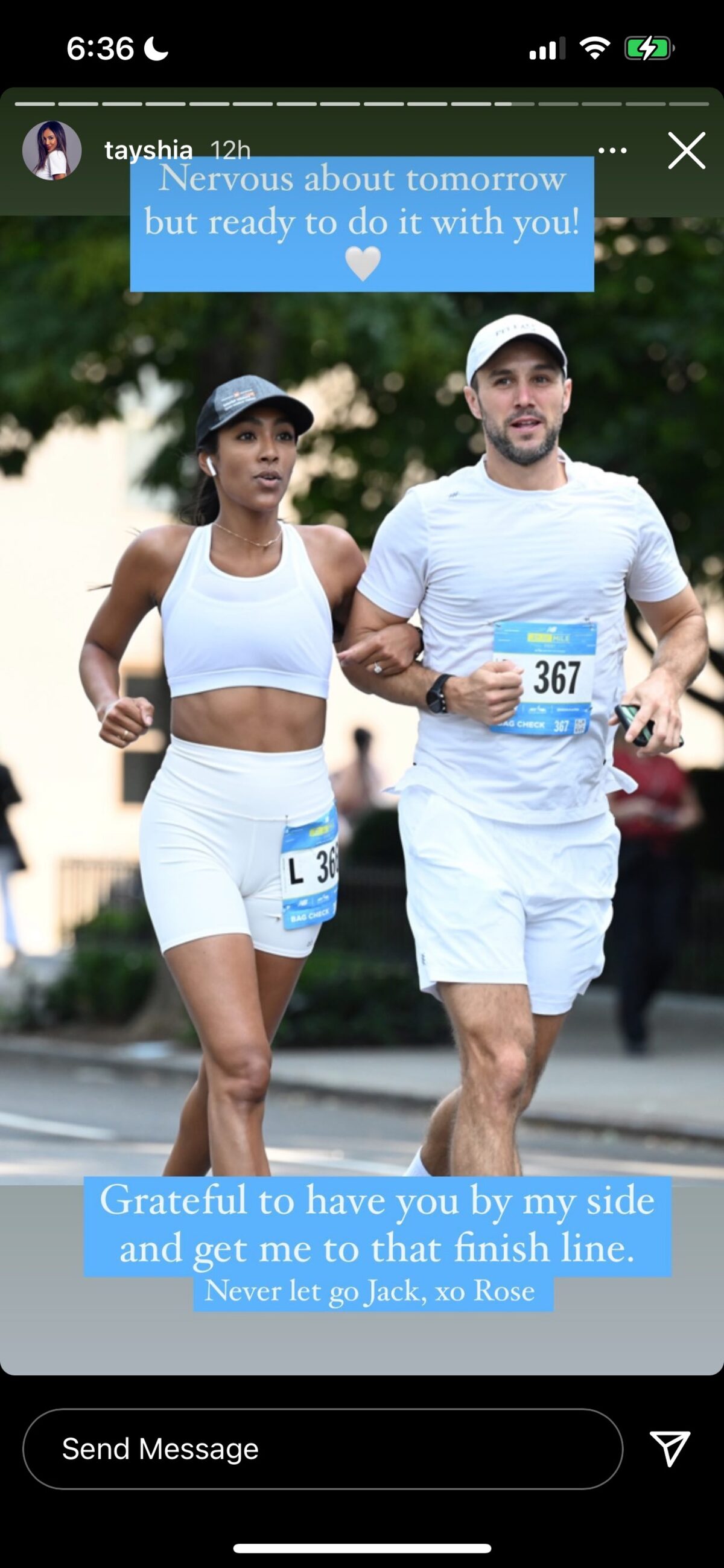 Zac was by Tayshia’s side every step of the way, and she took to Instagram before the race to share a photo of her and Zac, writing that she was nervous but “grateful to have you by my side and get me to that finish line.”