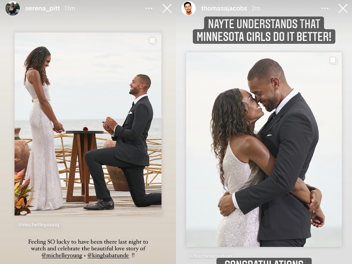 Thomas Jacobs, who is dating former Bachelorette Becca Kufrin, chimed in, writing, “Nayte understands that Minnesota girls do it better! CongratsMichelle and Nayte!”