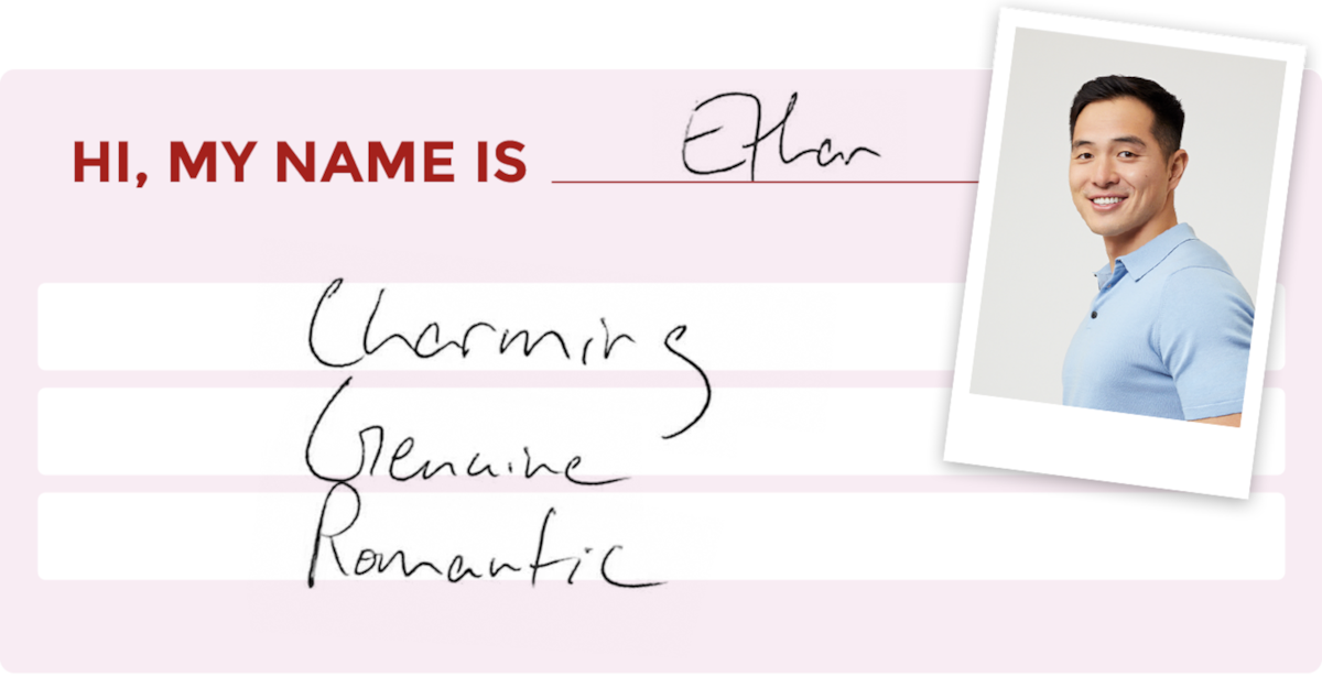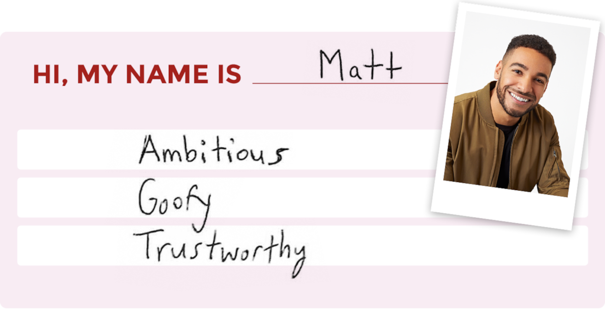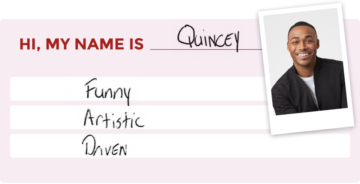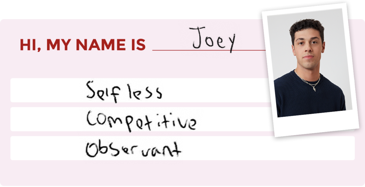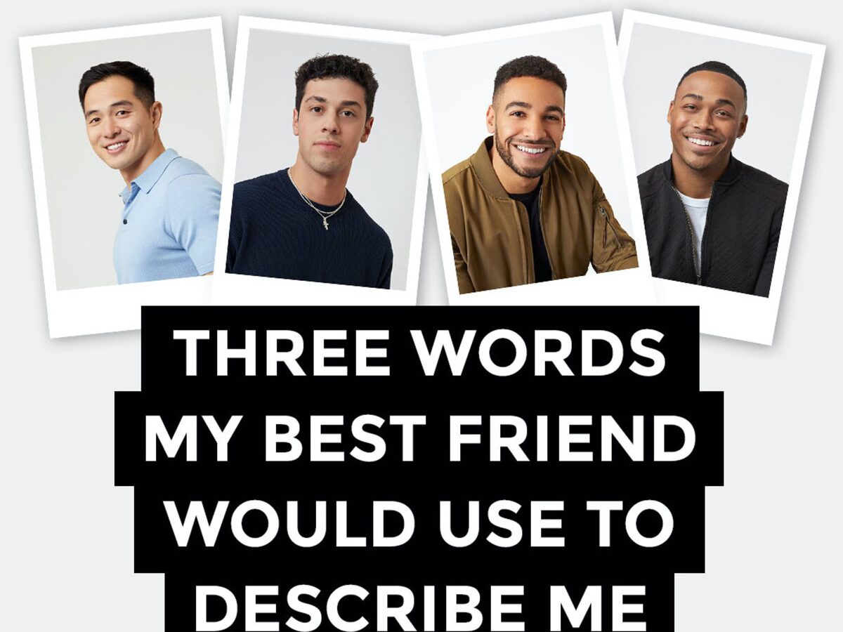 In handwritten notes, contestants Quincey, Matt, Joey, and Ethan introduce themselves as they respond to the following prompt: “Three words my best friend would use to describe me are...”
