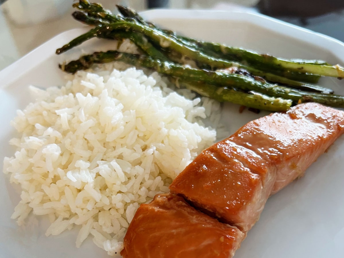 Remove from the oven at the 13-minute mark and serve with Parmesan-crusted asparagus, charred, roasted broccoli, and white rice. Delish!