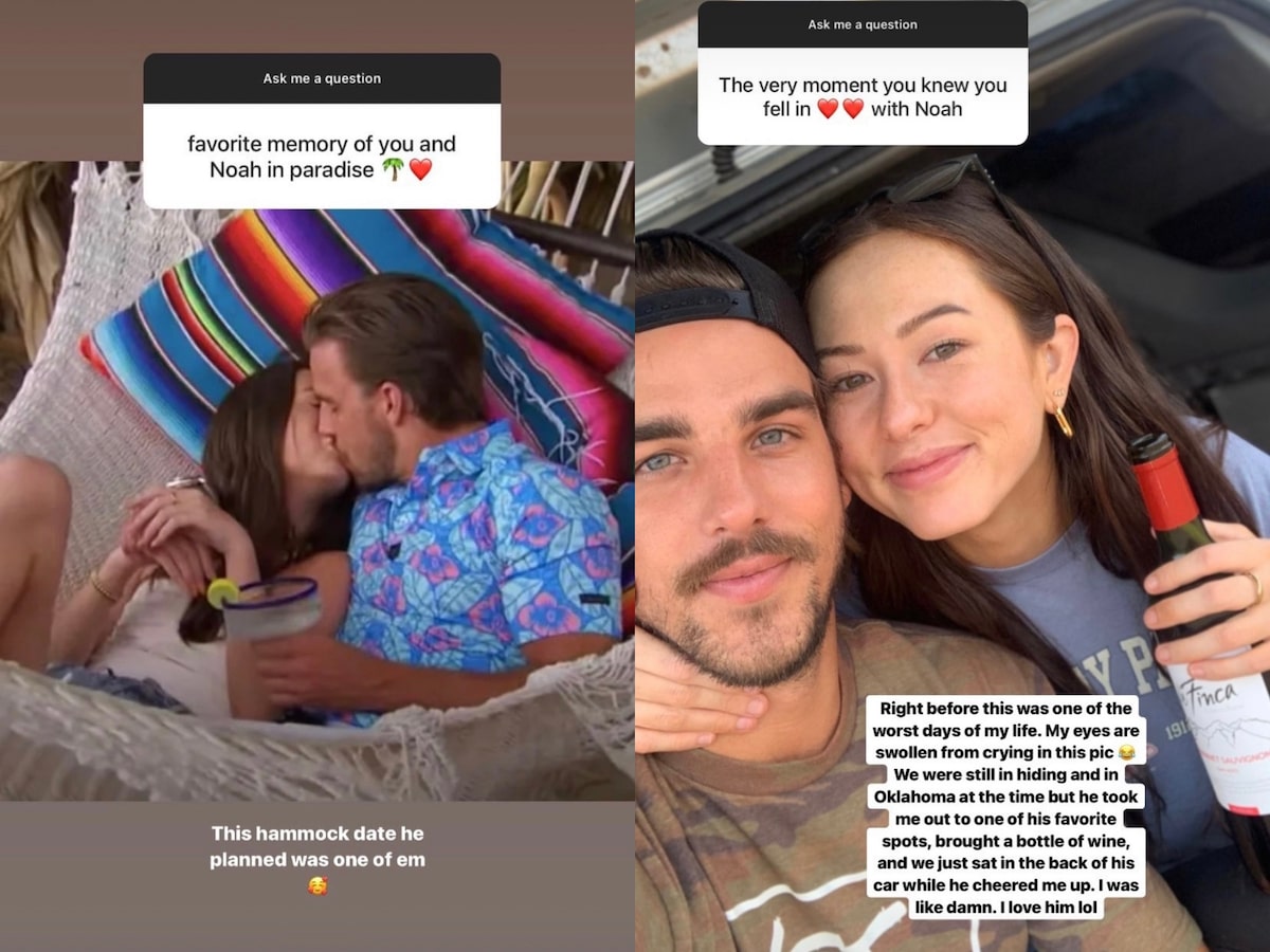 She also shared the moment that she knew she was in love with Noah writing, “Right before this was one of the worst days of my life. My eyes are swollen from crying in this pic. We were still in hiding and in Oklahoma at the time, but he took me out to one of his favorite spots, brought this bottle of wine, and we just sat in the back of his car while he cheered me up. I was like, ‘Damn, I love him.’ LOL!”