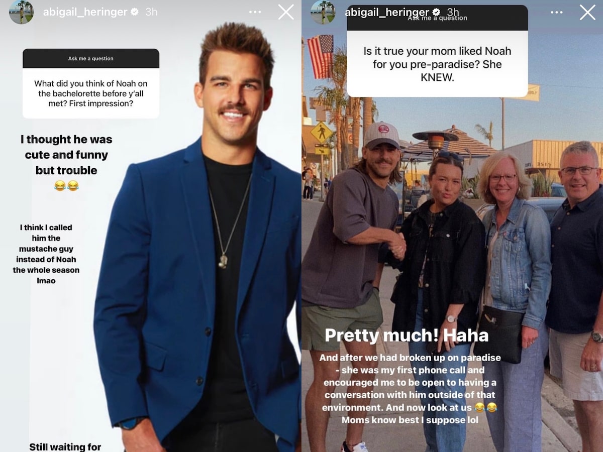 Abi said, “Pretty much haha! And after we had broken up in ‘Paradise,’ she was my first phone call and encouraged me to be open to having a conversation with him outside of that environment. And now look at us! Moms know best I suppose lol.”