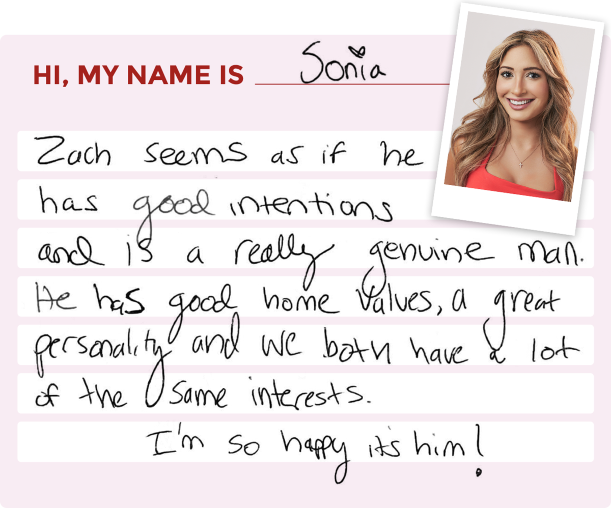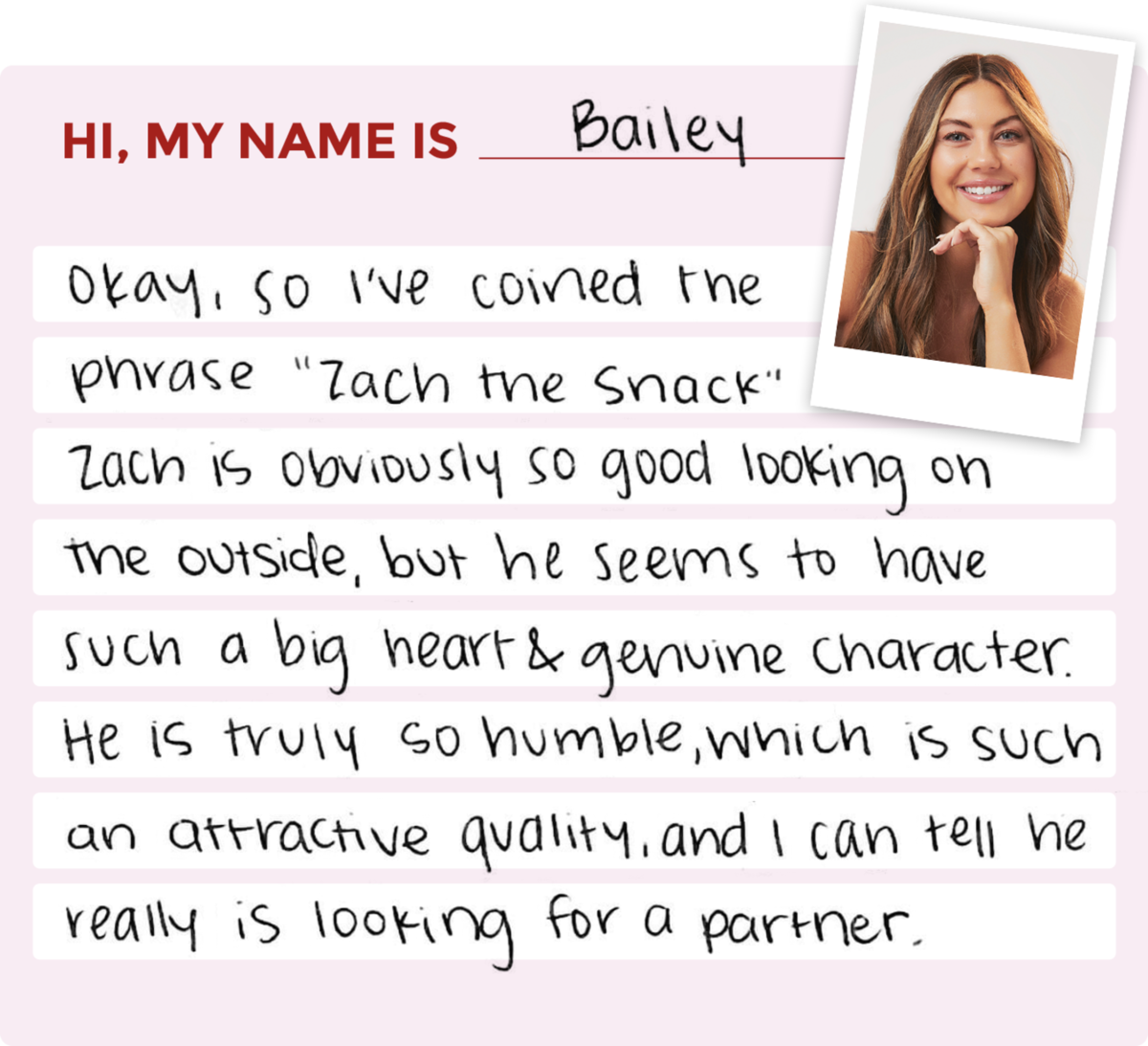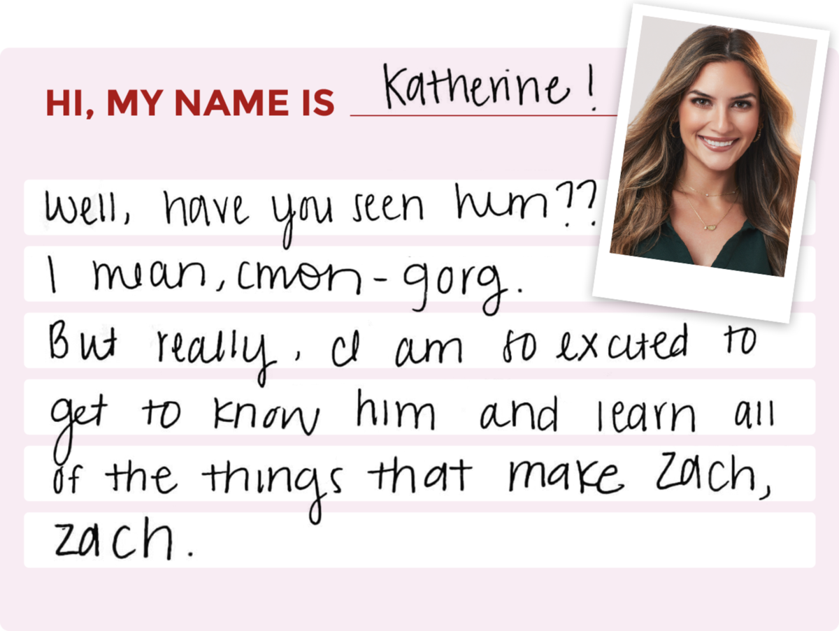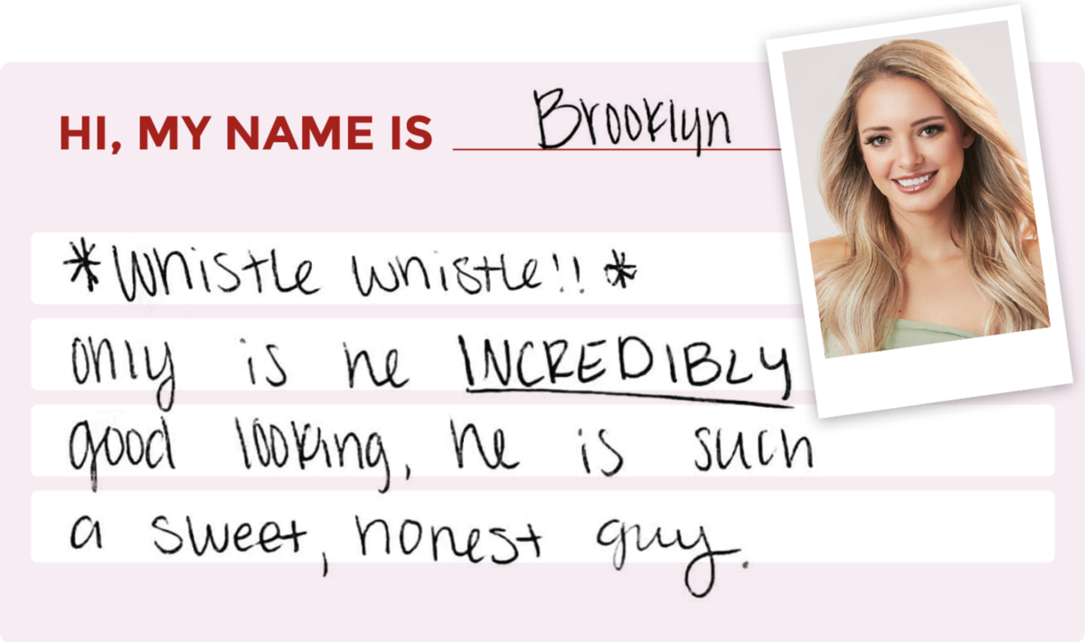 In handwritten notes, contestants Kimberly, Katherine, Brooklyn, Sonia, and Bailey introduce themselves as they respond to the following prompt: “I can’t wait to meet the Bachelor because...”