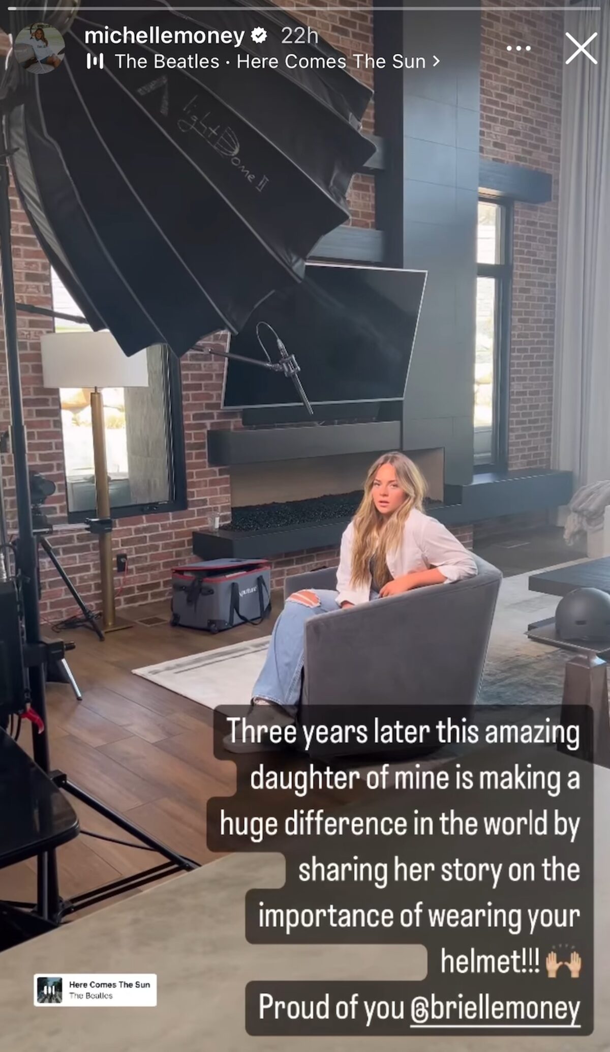 Alongside a photo of her daughter set up for a TV interview, Michelle wrote, “Three years later, this amazing daughter of mine is making a huge difference in the world by sharing her story on the importance of wearing your helmet. Proud of you Brielle Money!”