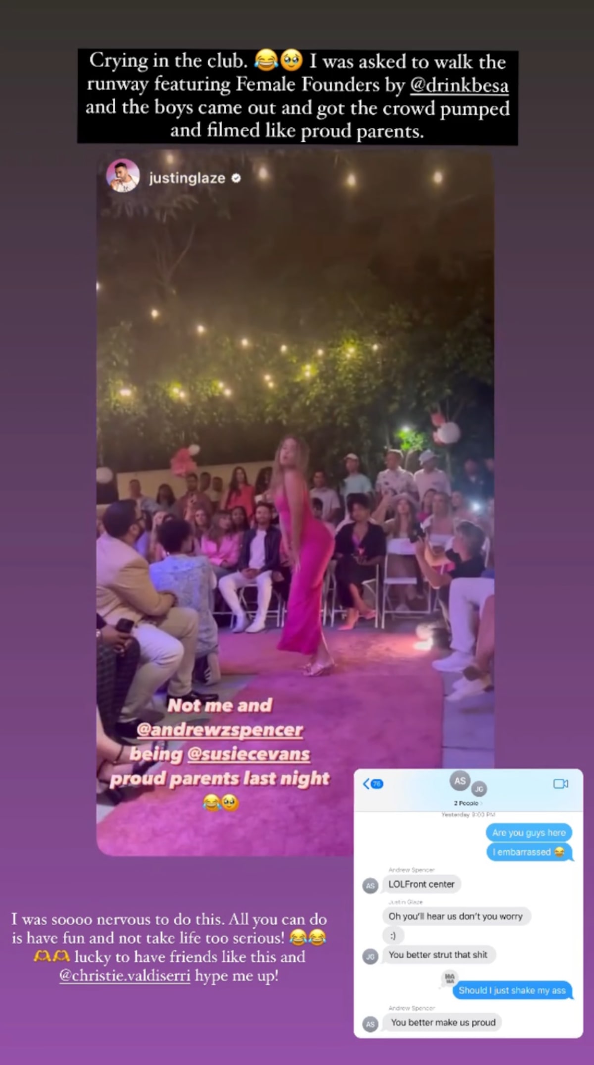 Susie got emotional feeling the love and support from her besties and wrote, “Crying in the club. I was asked to walk the runway featuring Female Founders and the boys came out and got the crowd pumped and filmed like proud parents.”