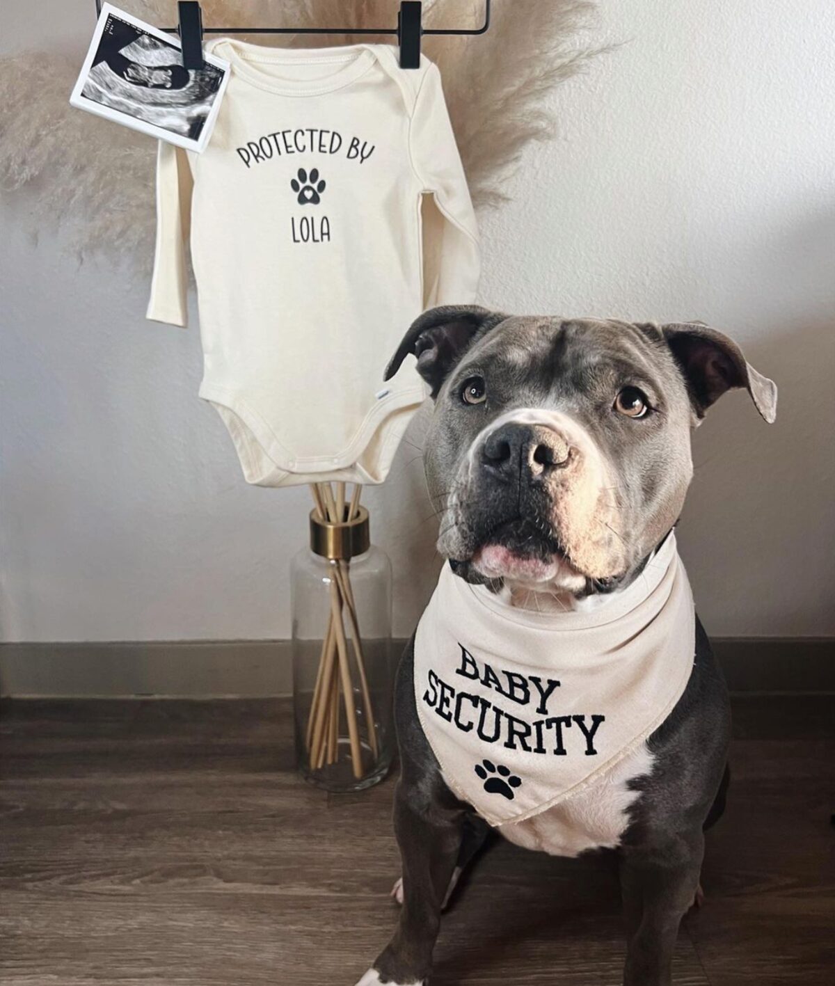 The onesie says, “Protected by Lola” and Lola’s bandana says, “Baby security.”