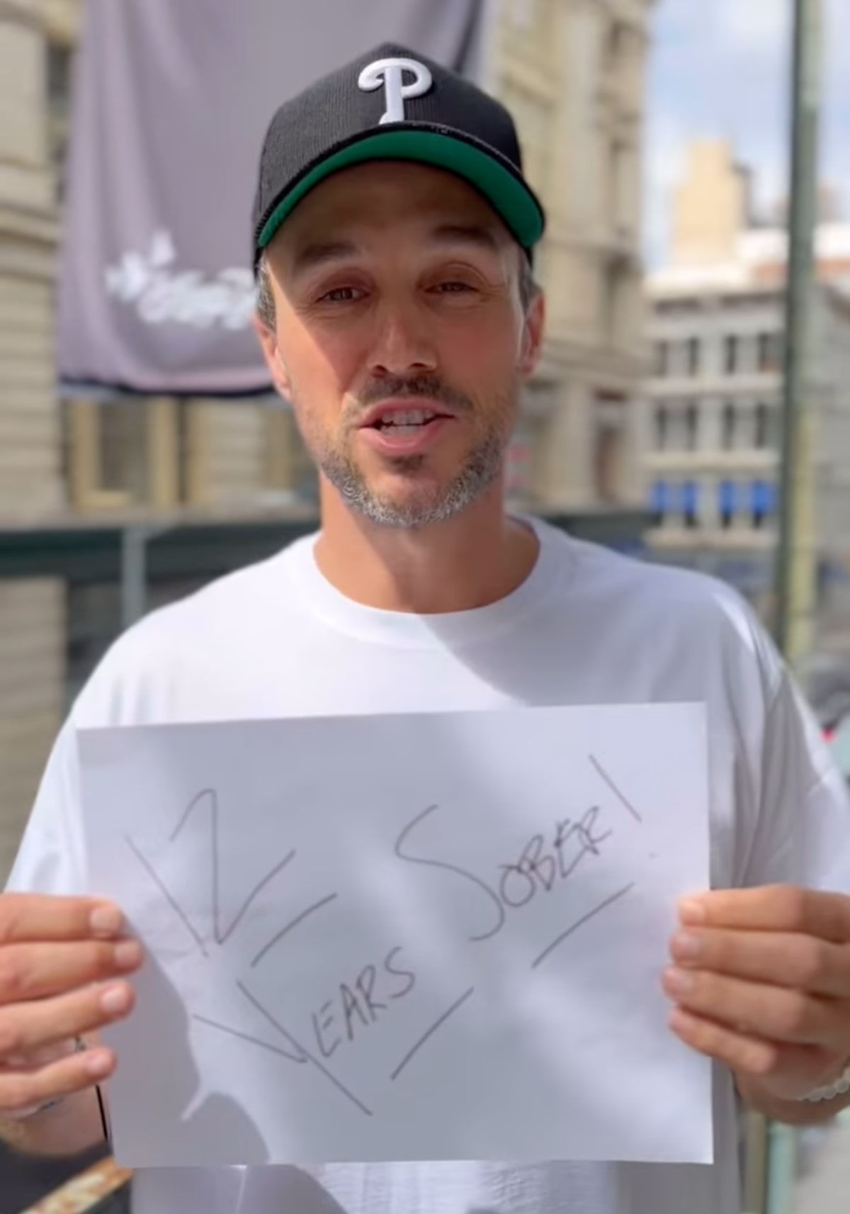 In the video, Zac is holding up a sign that says “12 years sober” and he talks candidly about how far he’s come.
