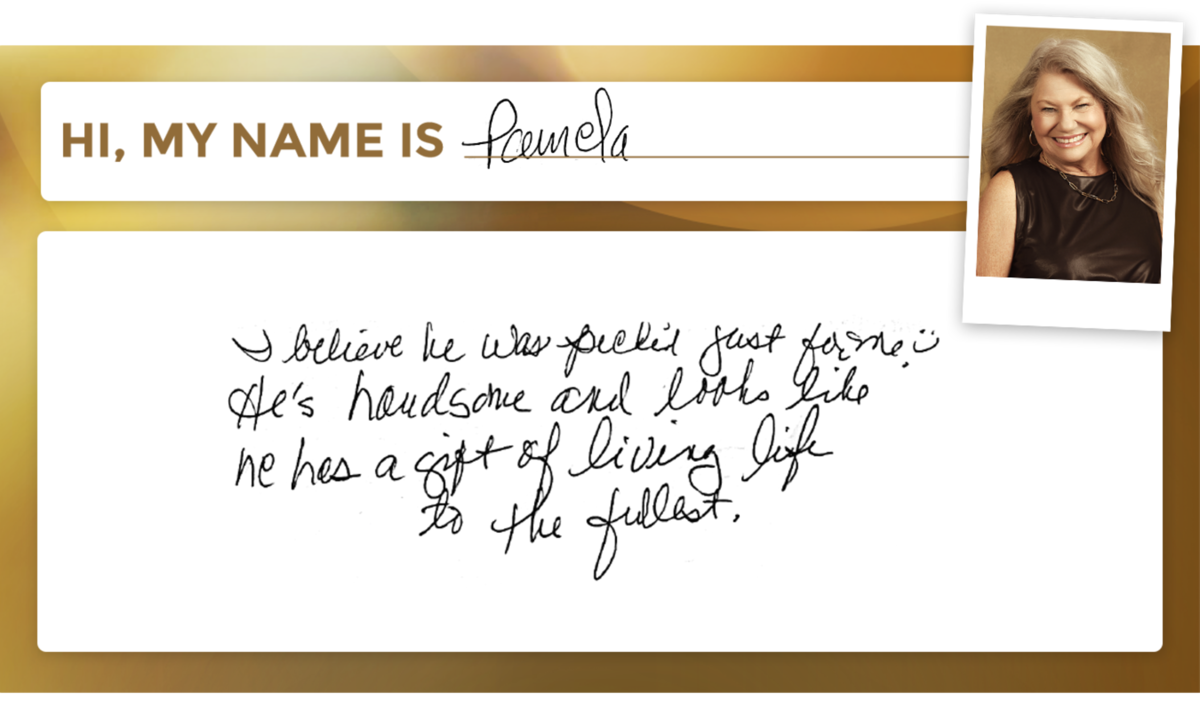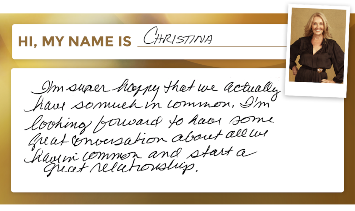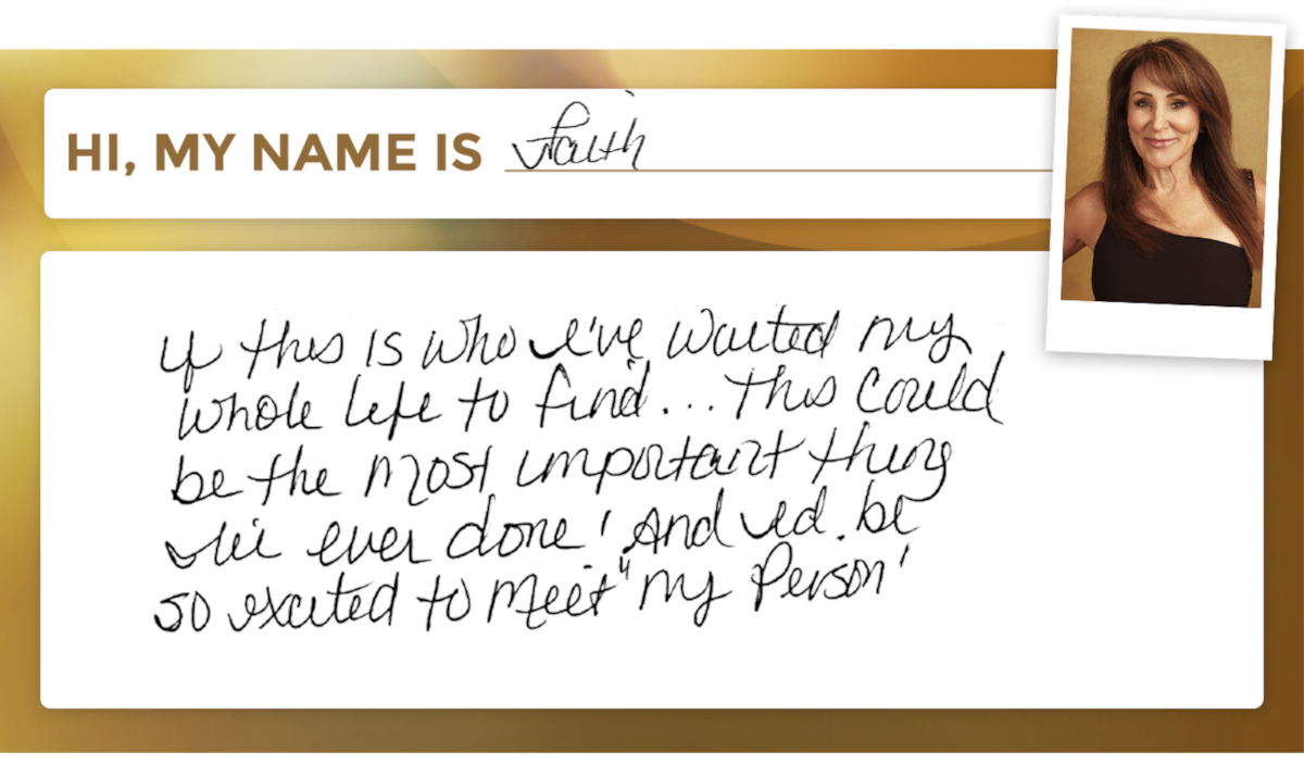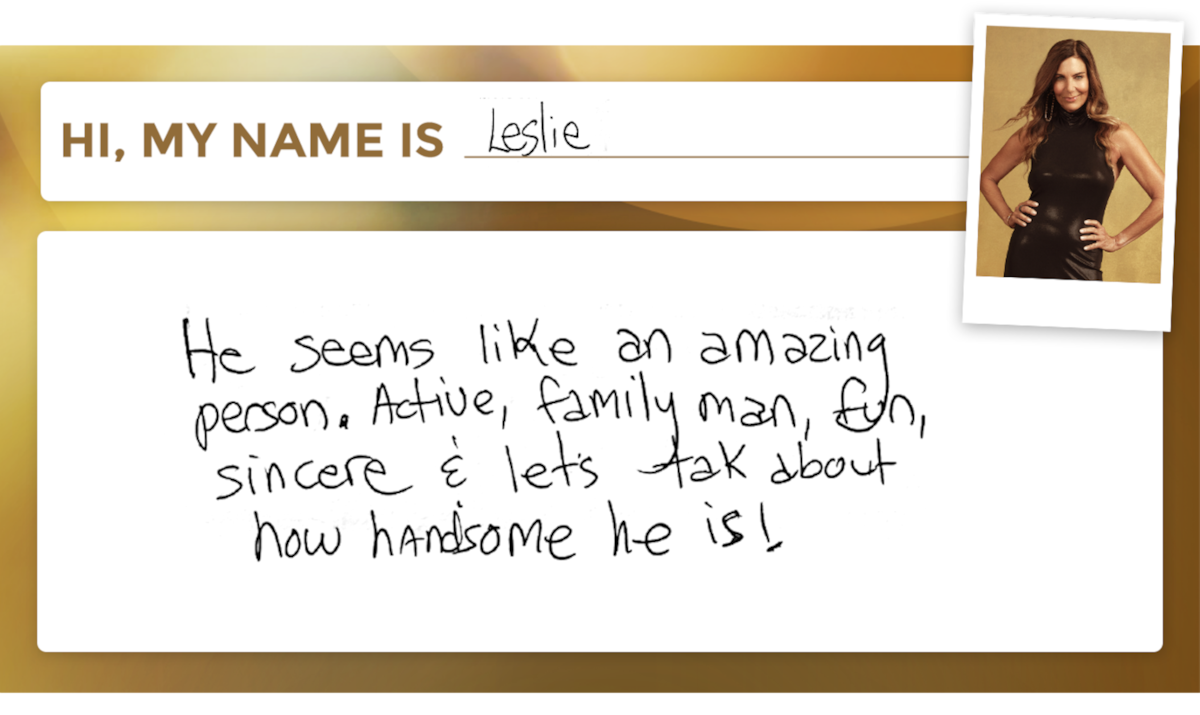 In handwritten notes, contestants Pamela, Christina, Faith, and Leslie introduce themselves as they respond to the following prompt: “I can't wait to meet the Golden Bachelor because…”