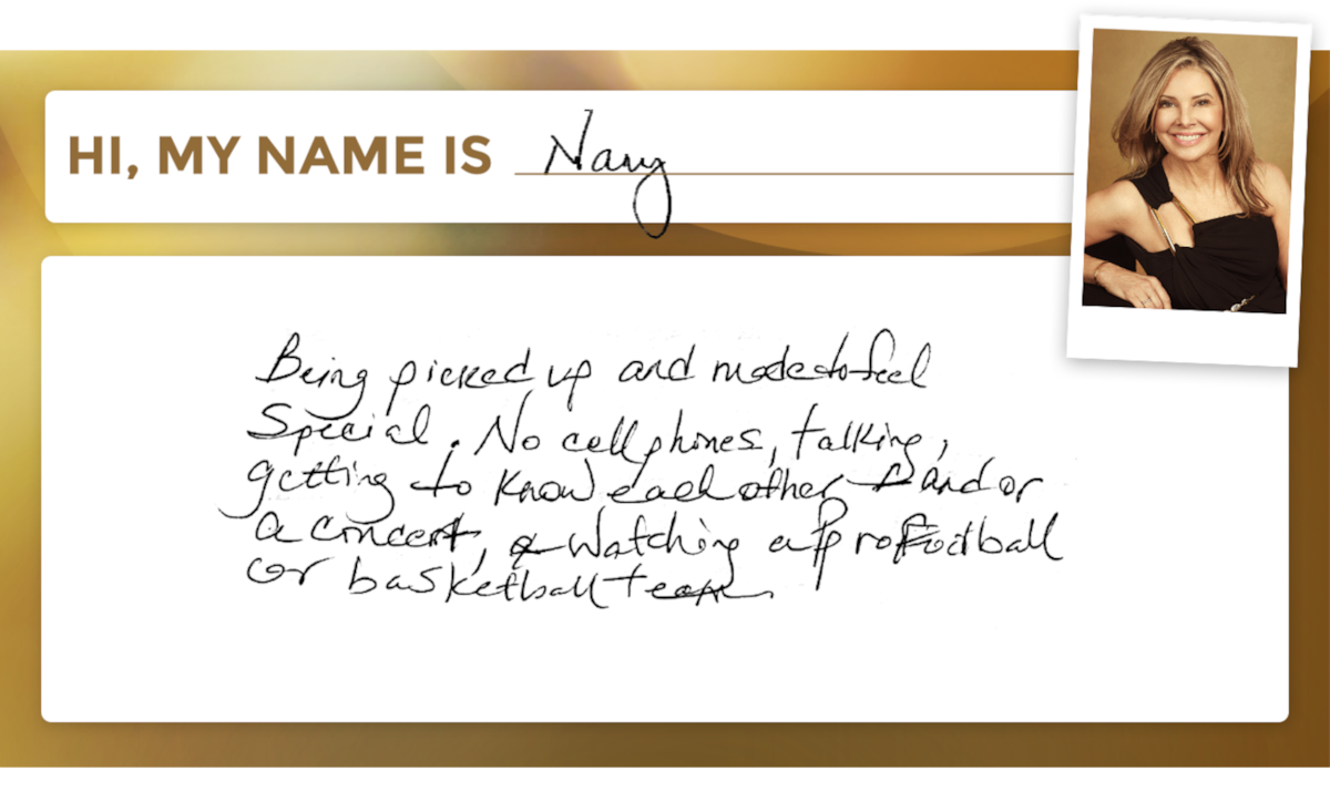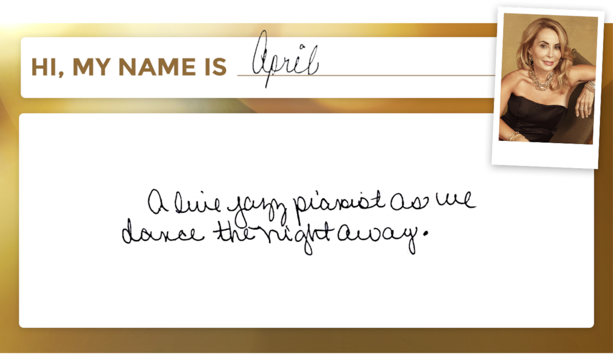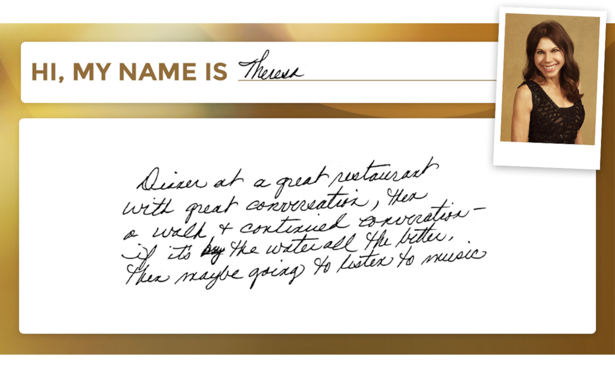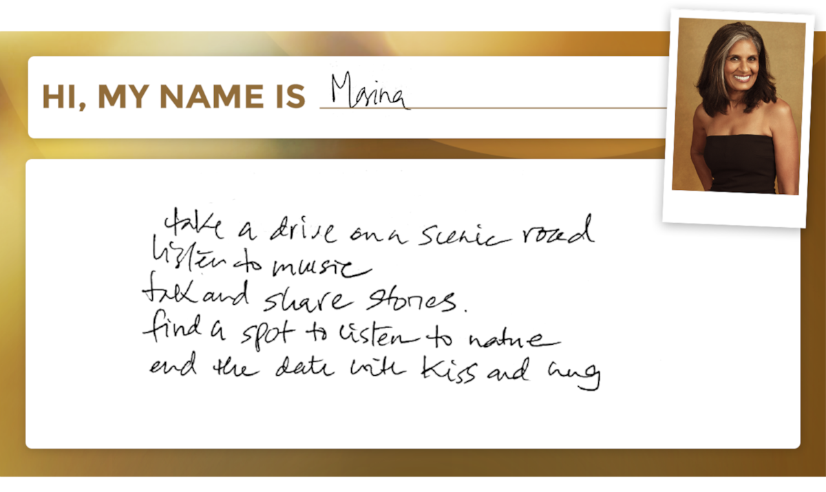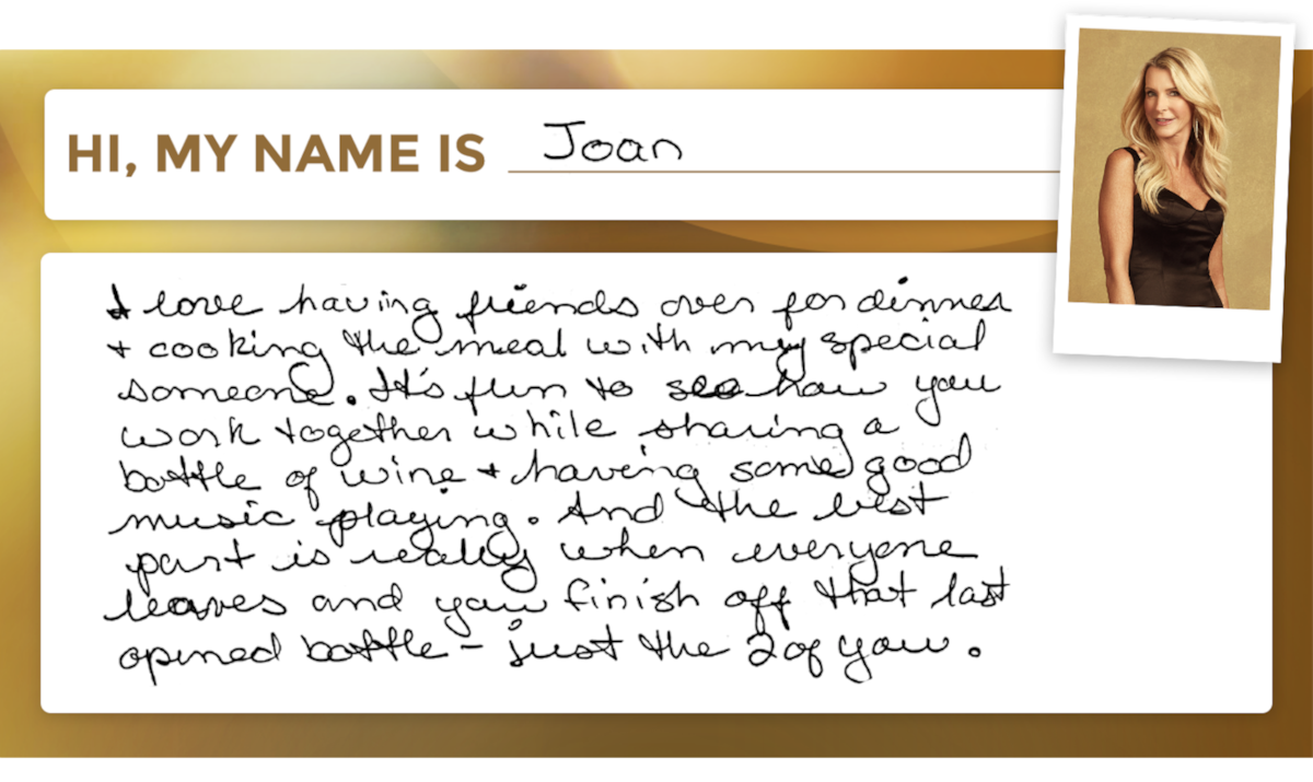 In handwritten notes, contestants Theresa, Nancy, Marina, Joan, and April introduce themselves as they respond to the following prompt: “My idea of a perfect date is...”