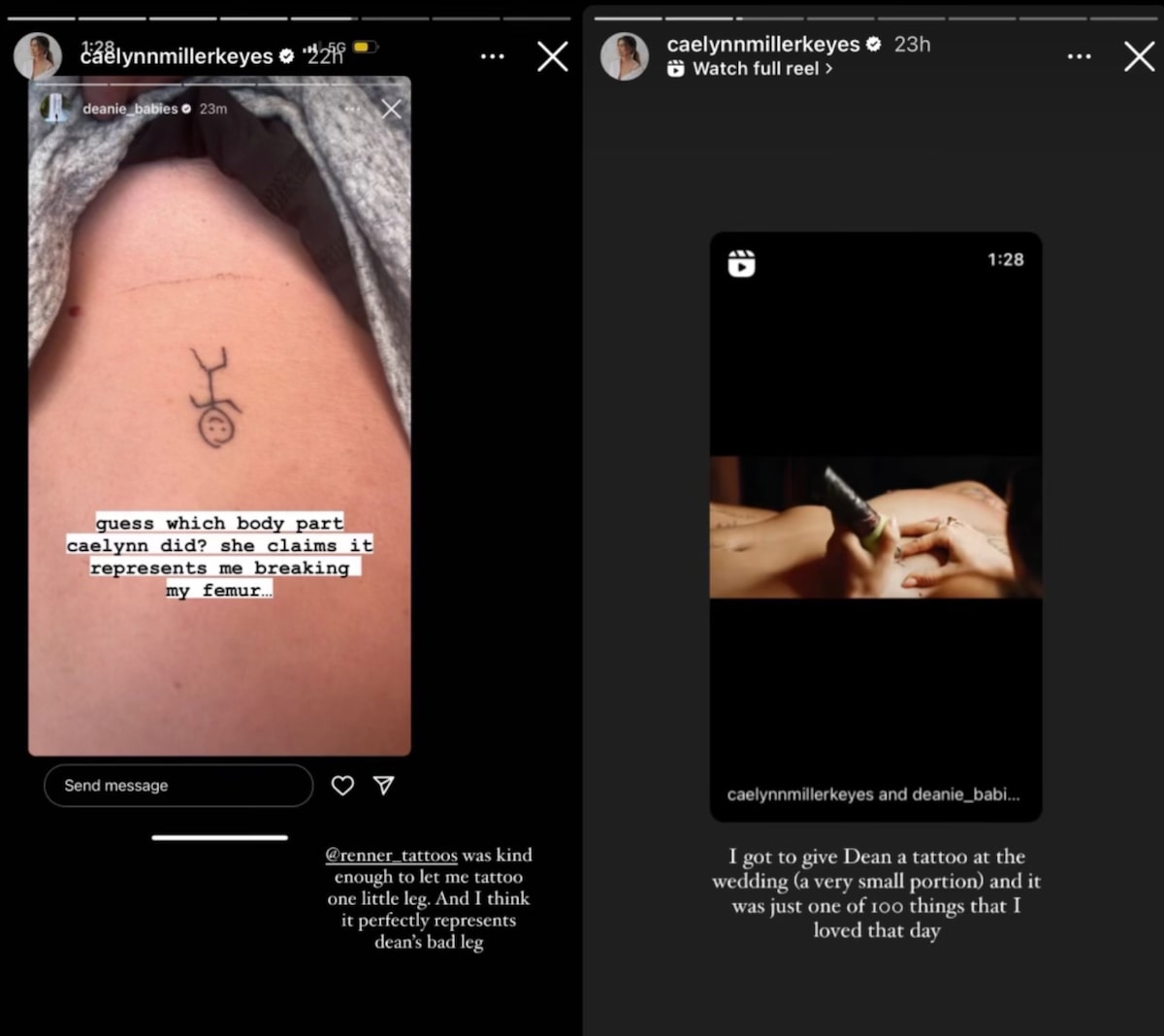 Caelynn reshared the photo to her Story and said, “Renner Tattoos was kind enough to let me tattoo one little leg and I think it perfectly represents Dean’s bad leg.”