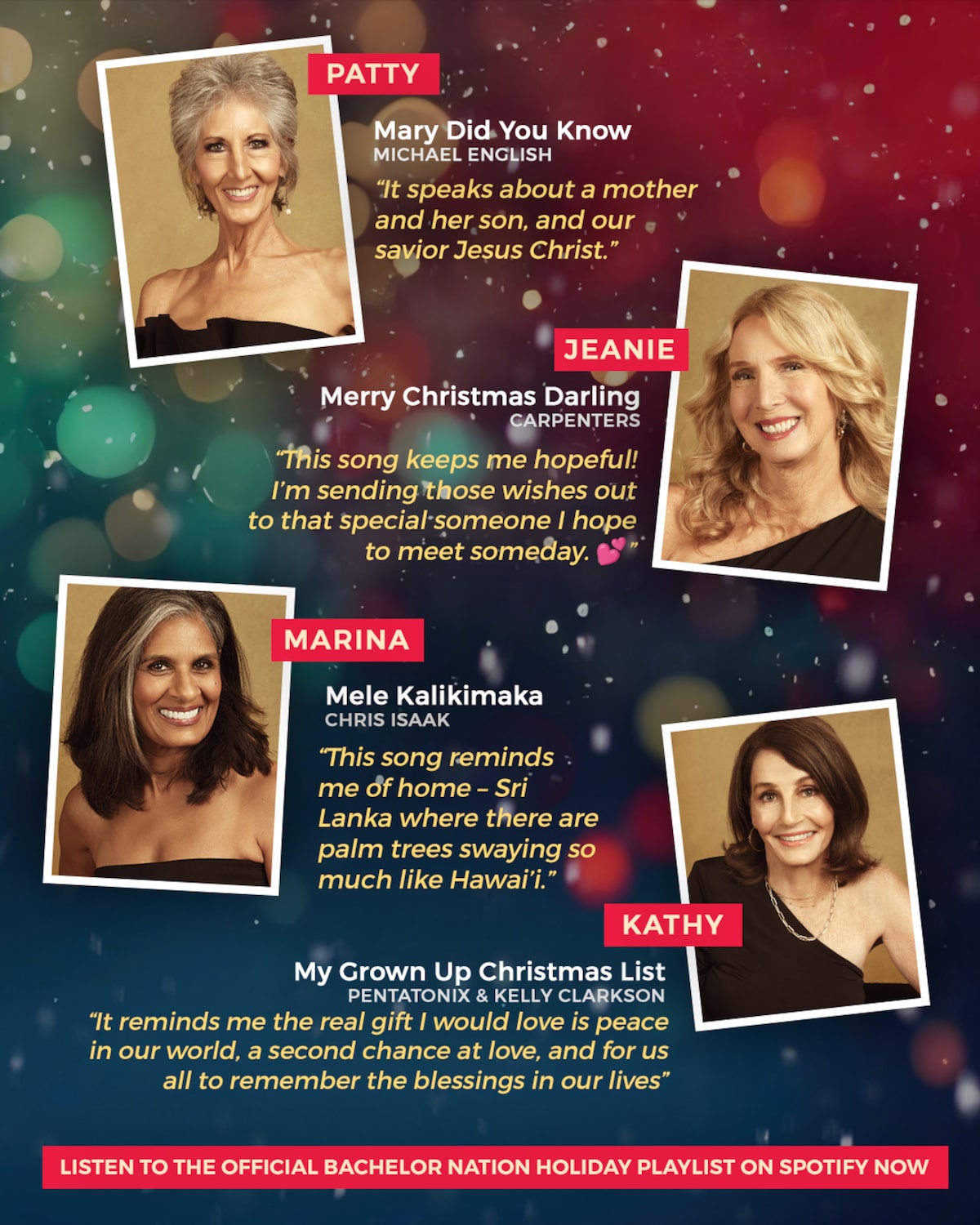 At this joyful time of year, “The Golden Bachelor” cast shared their favorite holiday songs, and we put together a Spotify playlist with all of them for you to listen to — enjoy it here!