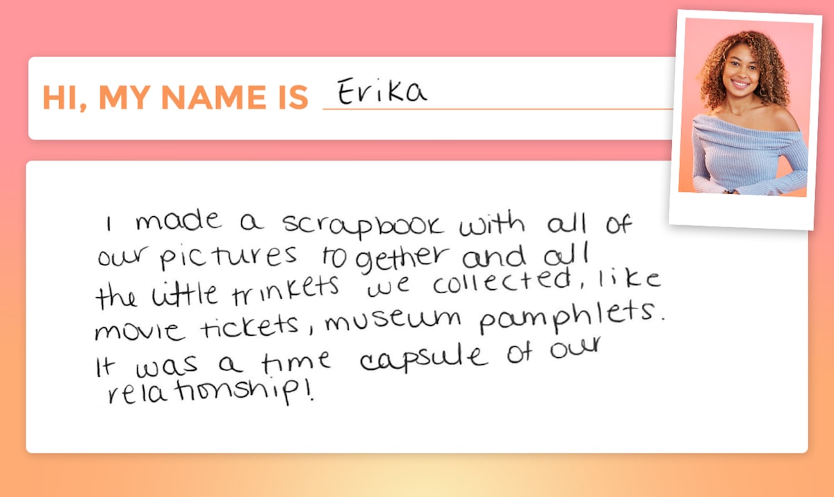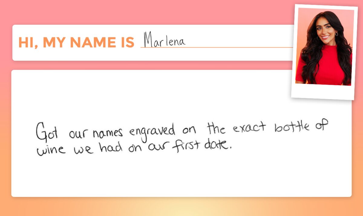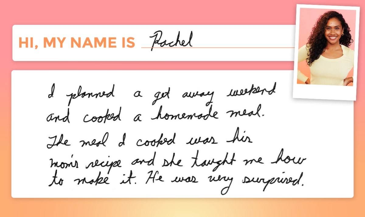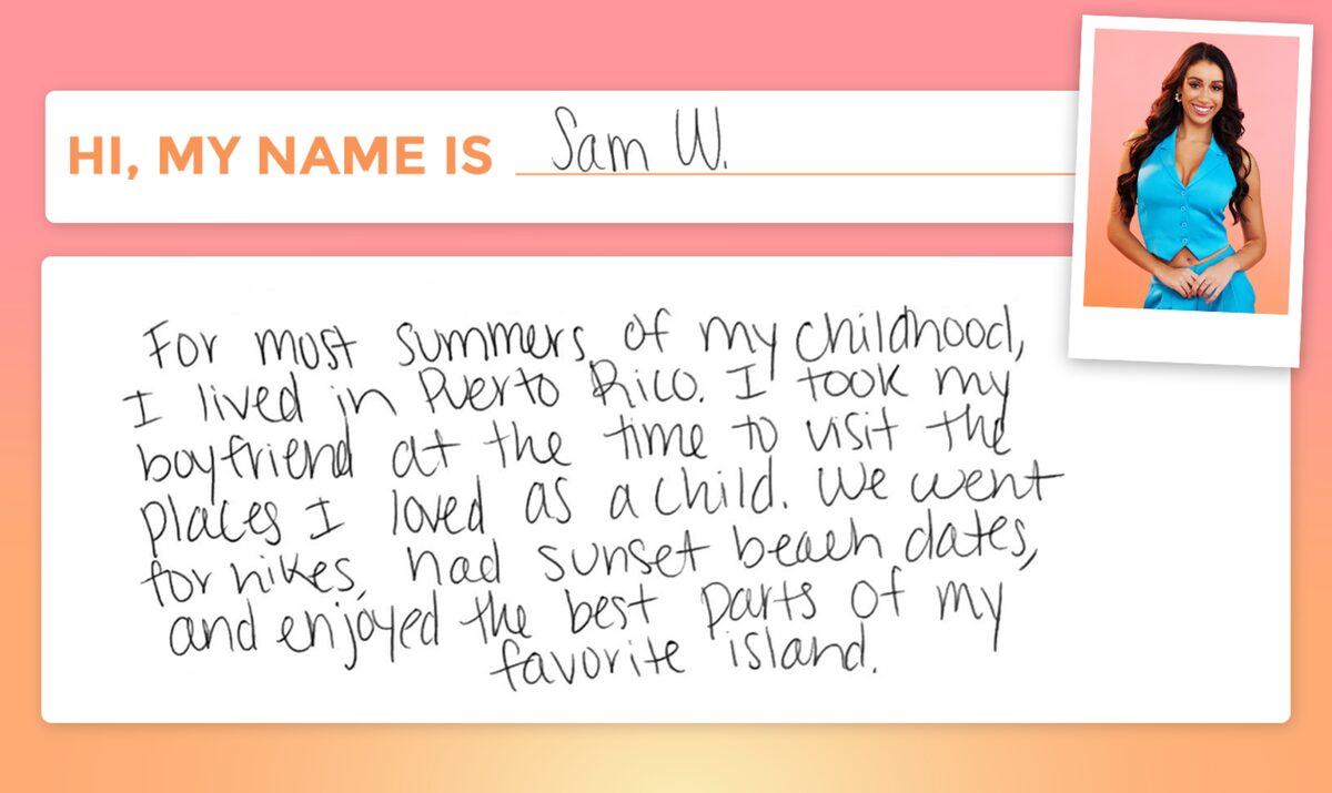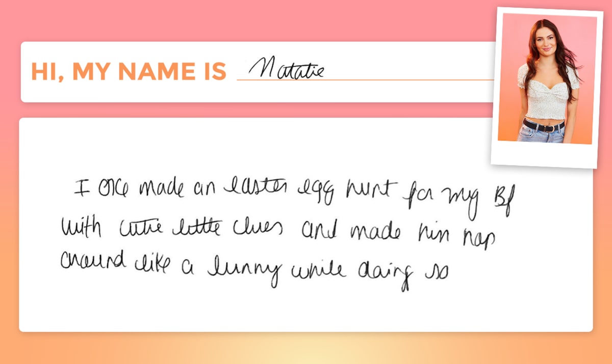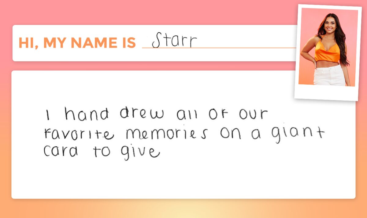In handwritten notes, contestants Starr, Samantha, Rachel, Natalie, Marlena, and Erika introduce themselves as they respond to the following prompt: “The most romantic thing I've ever done for someone is...”
