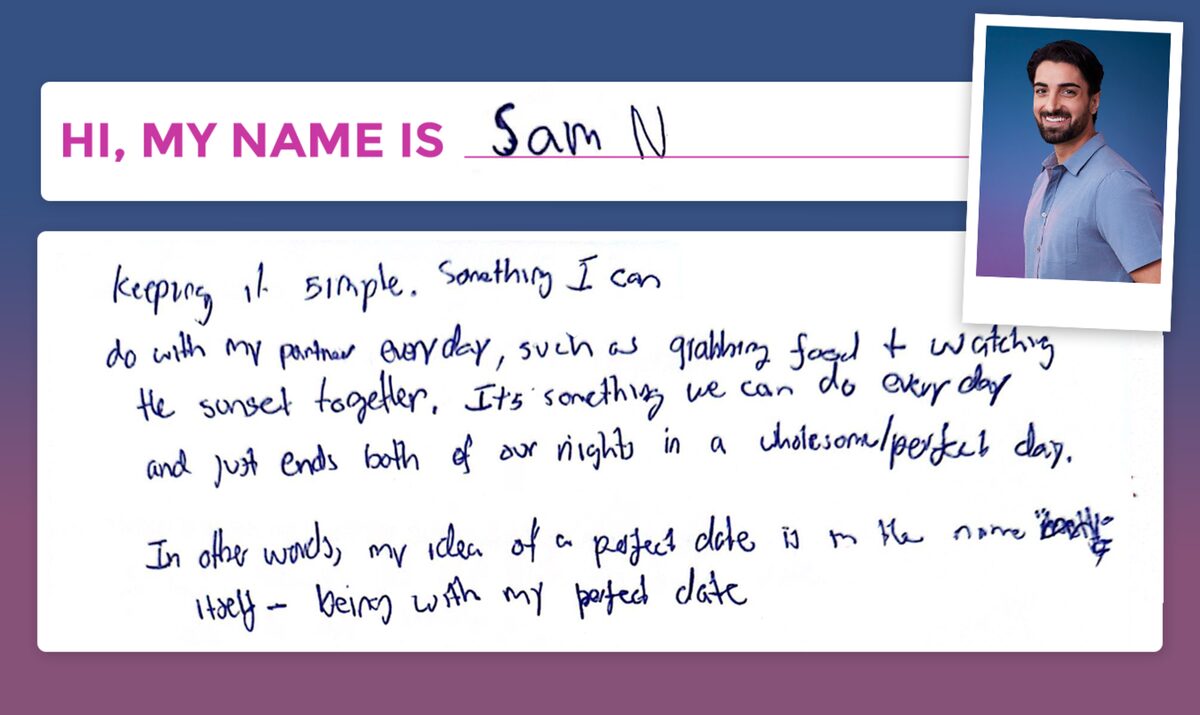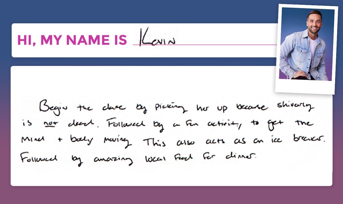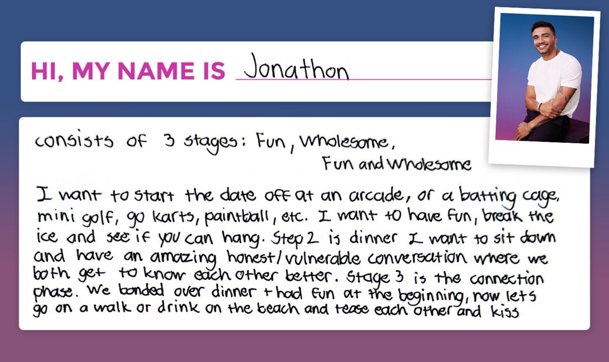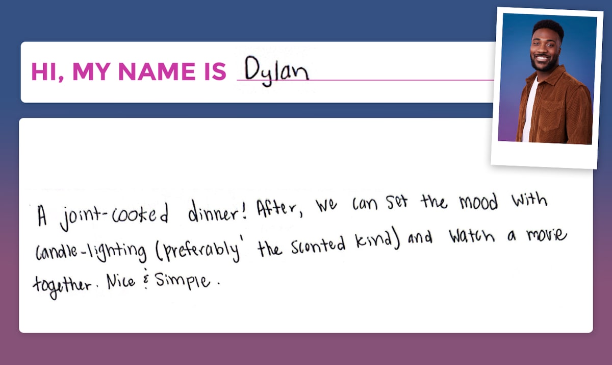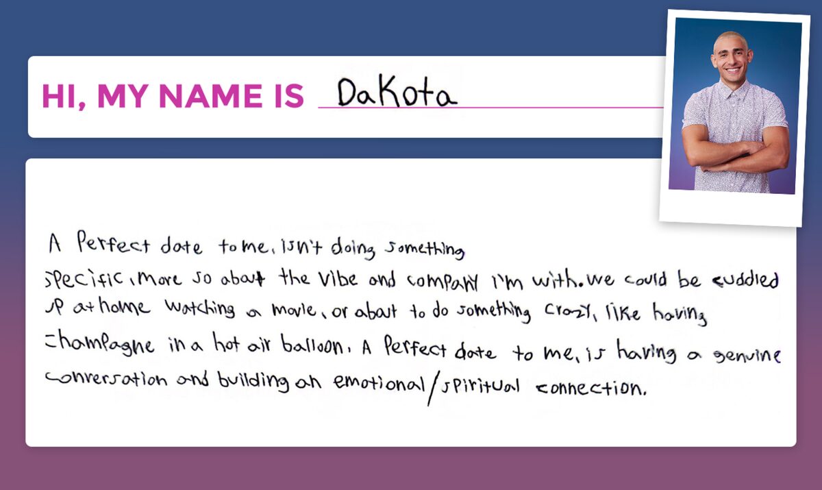 In handwritten notes, contestants Dakota, Dylan, Jonathon, Kevin, and Sam N. introduce themselves as they respond to the following prompt: “My idea of a perfect date is...”