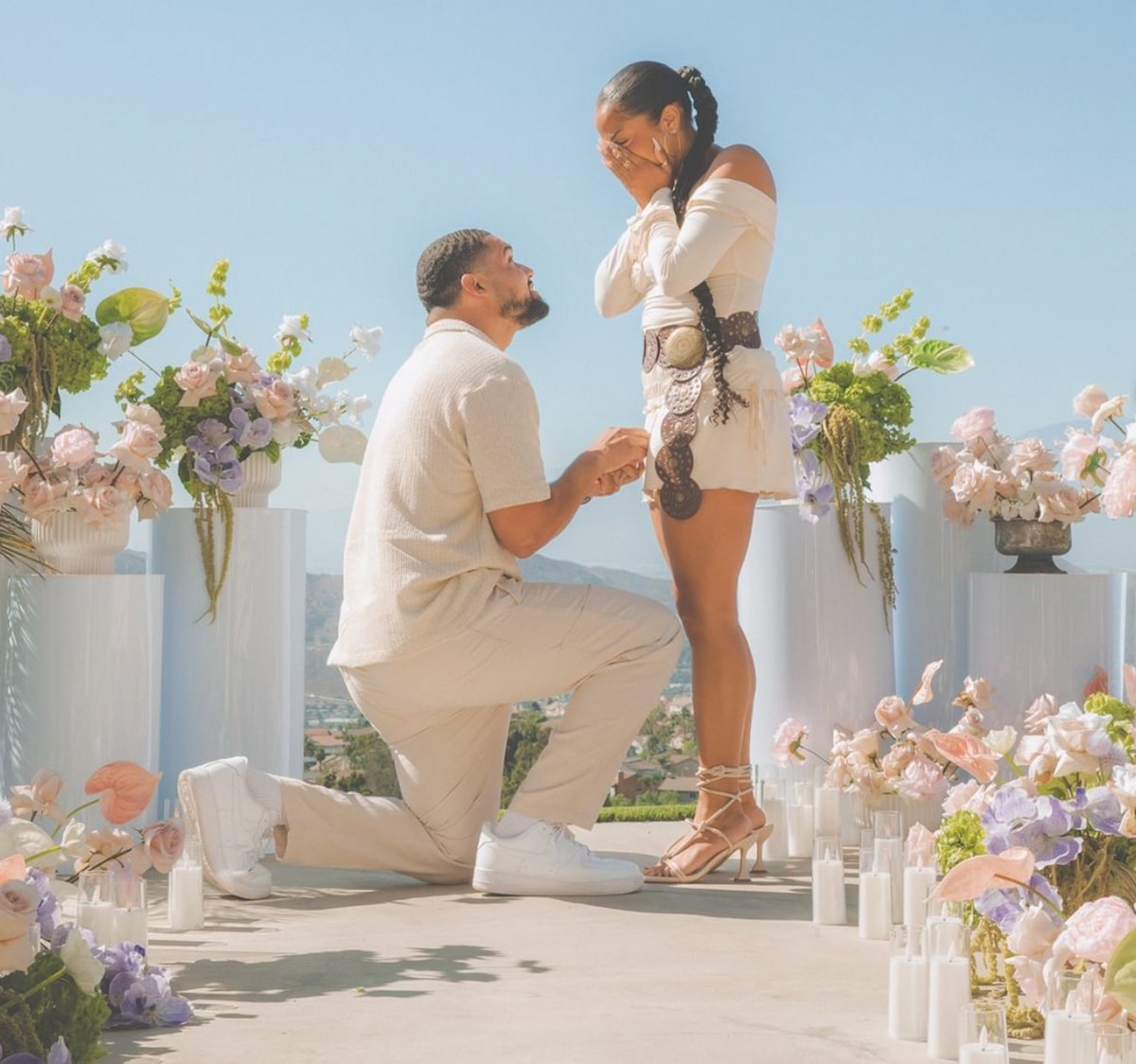 In the pics, Rodney is seen getting down on one knee as the two are surrounded by pink, purple, and white flowers.