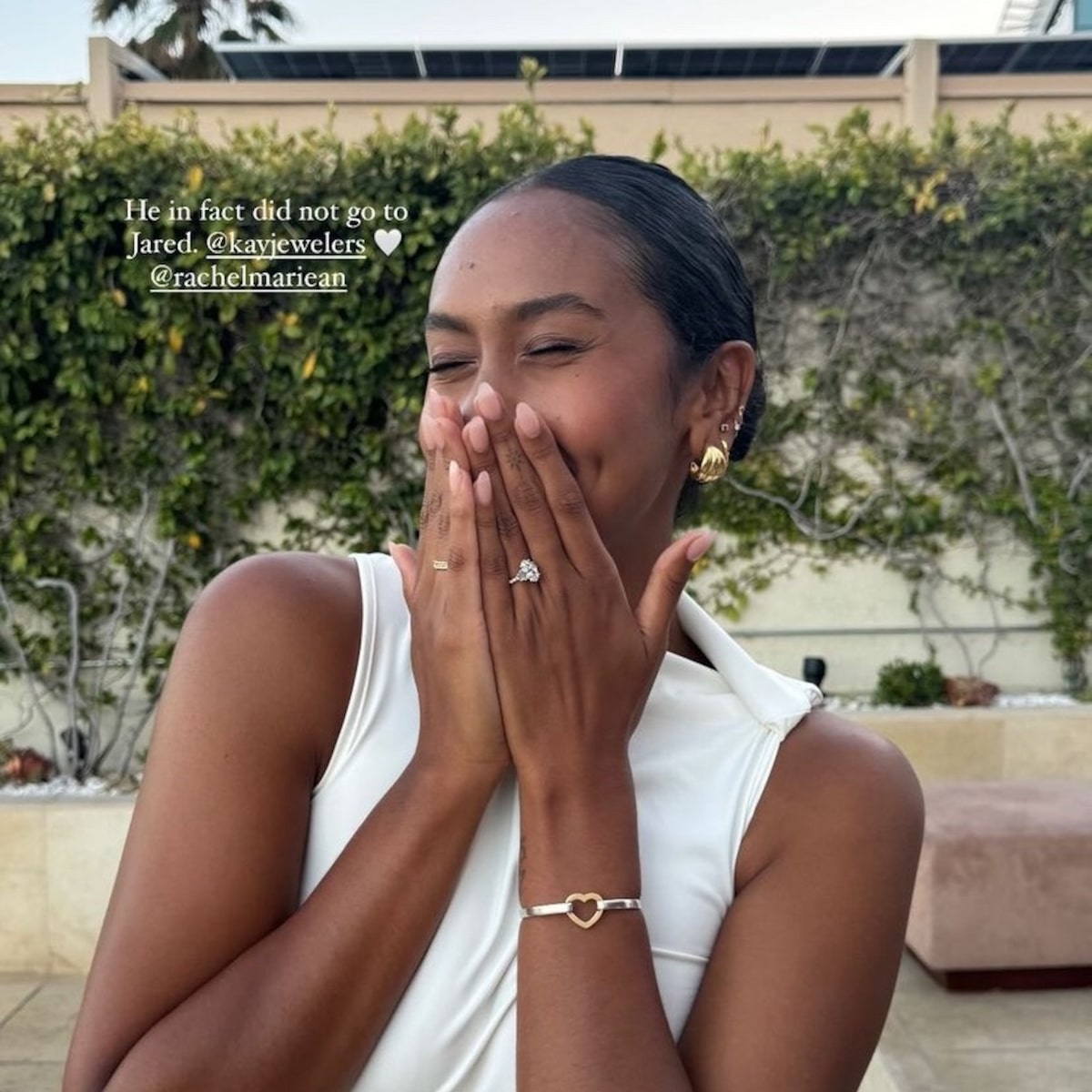 In an Instagram Story, Daisy posted a photo of Rachel with a beautiful ring and wrote, “He in fact did not go to Jared” and tagged Kay Jewelers.