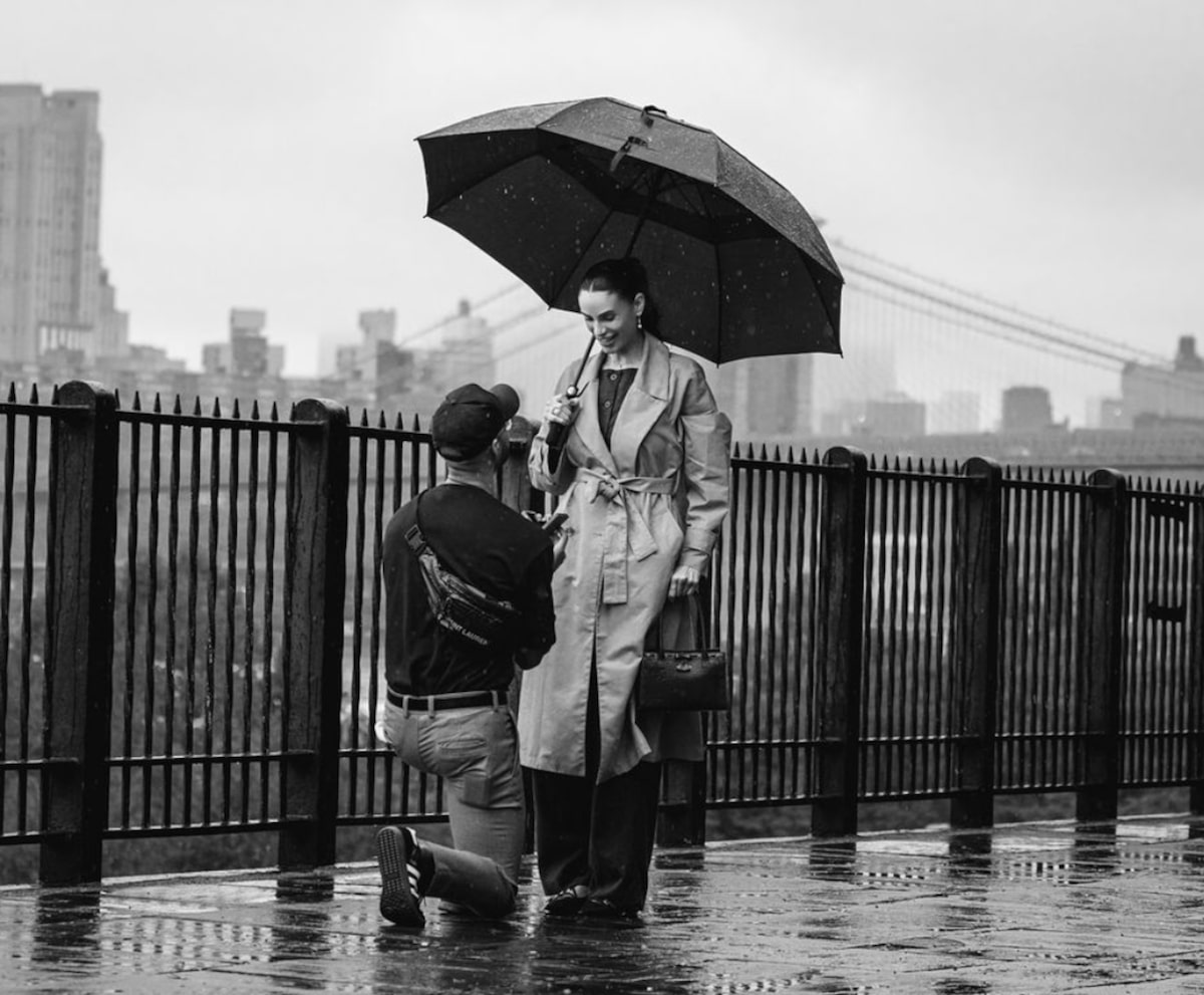 Alongside gorgeous black and white photos of Jordan proposing in the rain on the Brooklyn Bridge Promenade, Corrinne wrote, “The future Mr. & Mrs. Chapman💍”