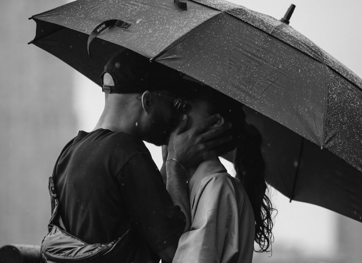 Corrinne is holding a giant umbrella for the both of them and is seen to be shocked as Jordan pops the question.