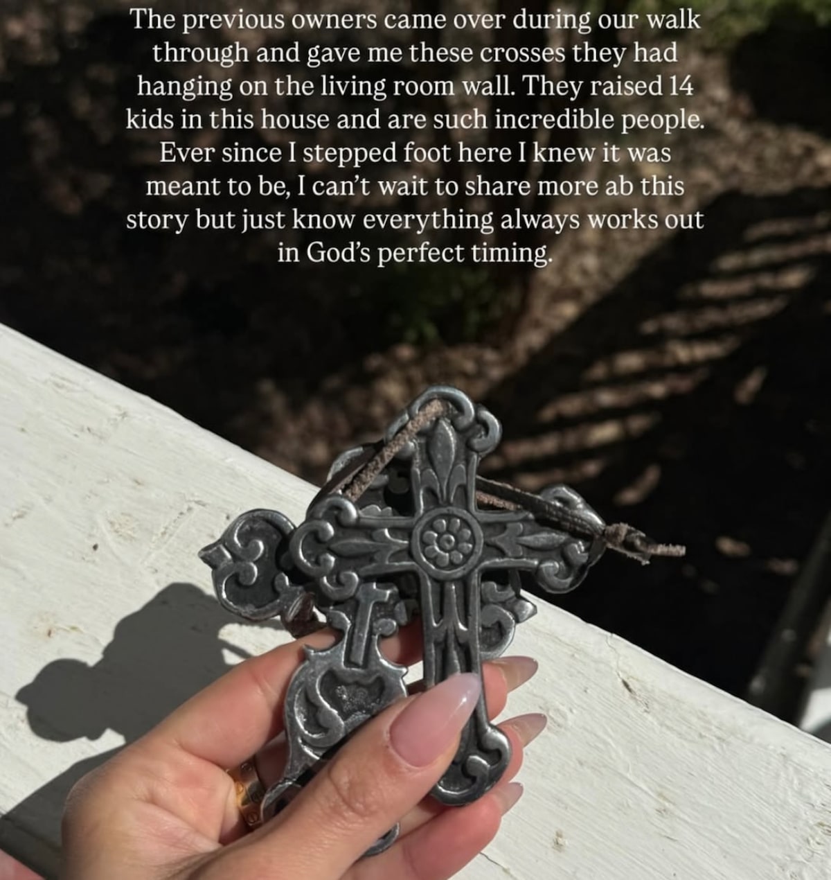 She posted a picture of two metal crosses in her hand and wrote, “The previous owners came over during our walk through and gave me these crosses they had hanging on the living room wall. They raised 14 kids in this house and are such incredible people. Ever since I stepped foot here I knew it was meant to be.”