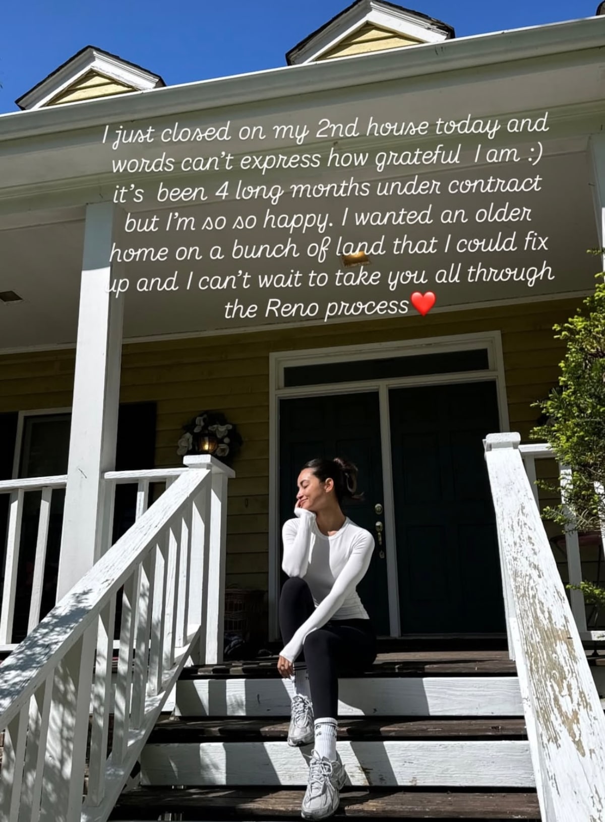 She said, “I just closed on my 2nd house today and words can’t express how grateful I am :) It’s been 4 long months under contract but I’m so so happy. I wanted an older home on a bunch of land that I could fix up and I can’t wait to take you all through the Reno process ♥️”