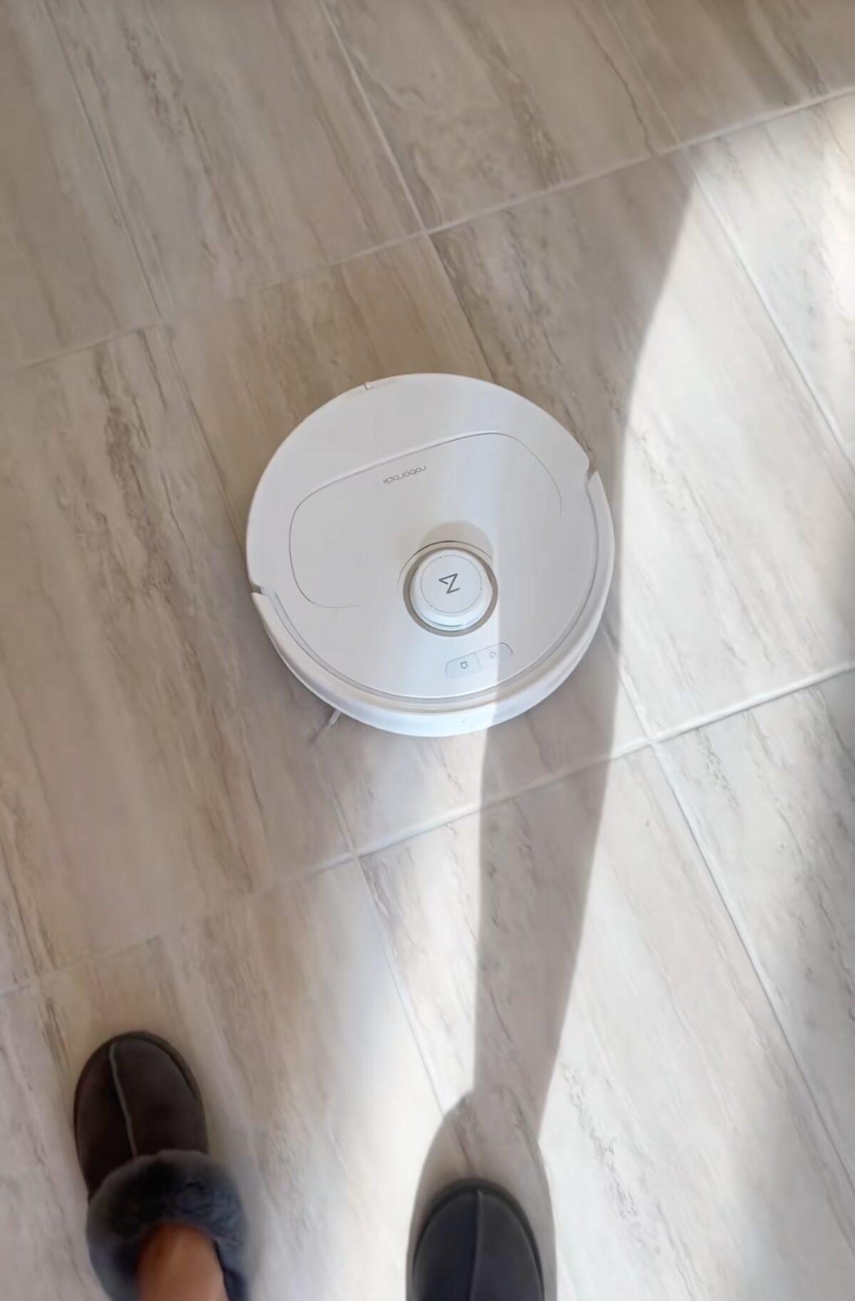 And she reveals a Roomba vacuum cleaner following her around cleaning up the floor.