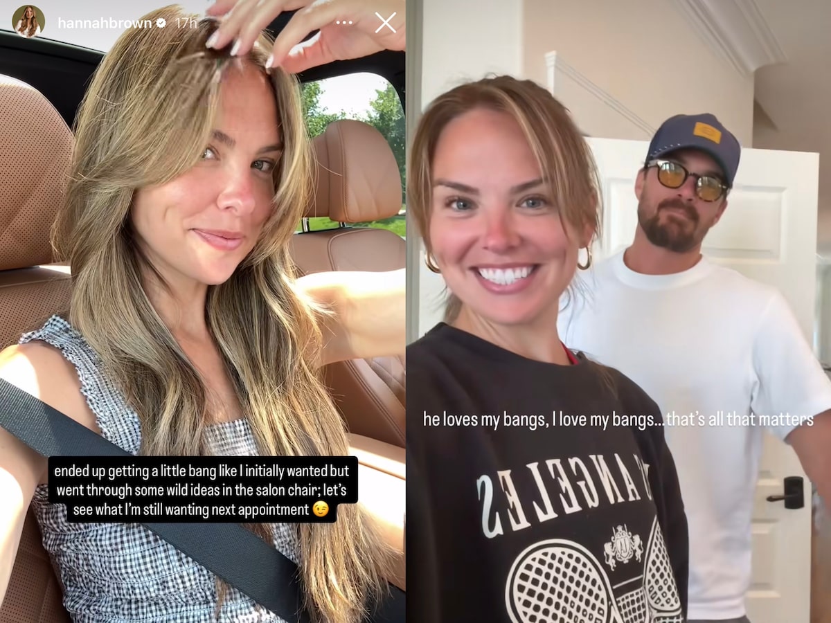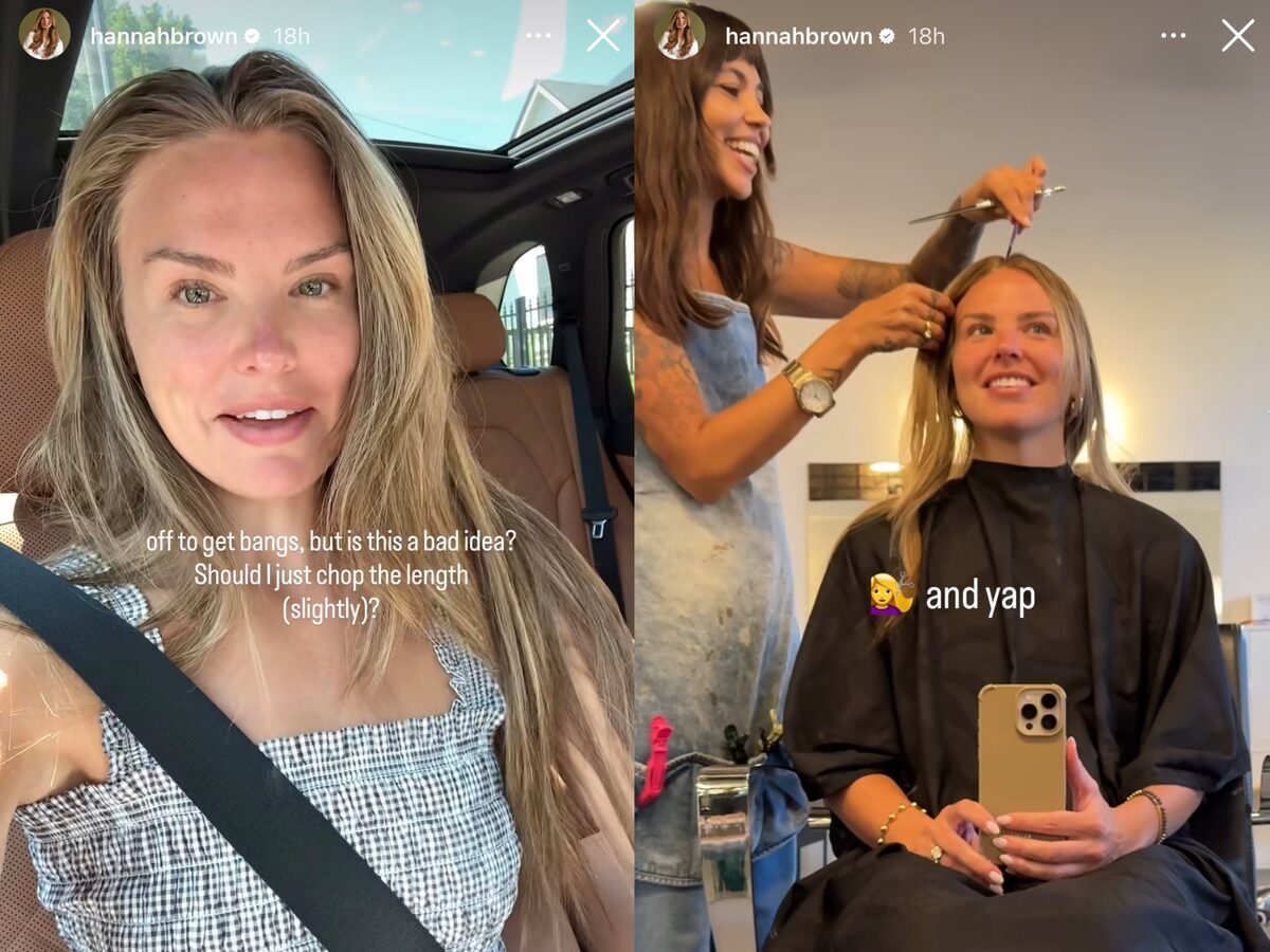 In a series of snapshots and videos on her IG Story, Hannah asked, “Off to get bangs, but is this a bad idea? Should I just chop the length (slightly)?”