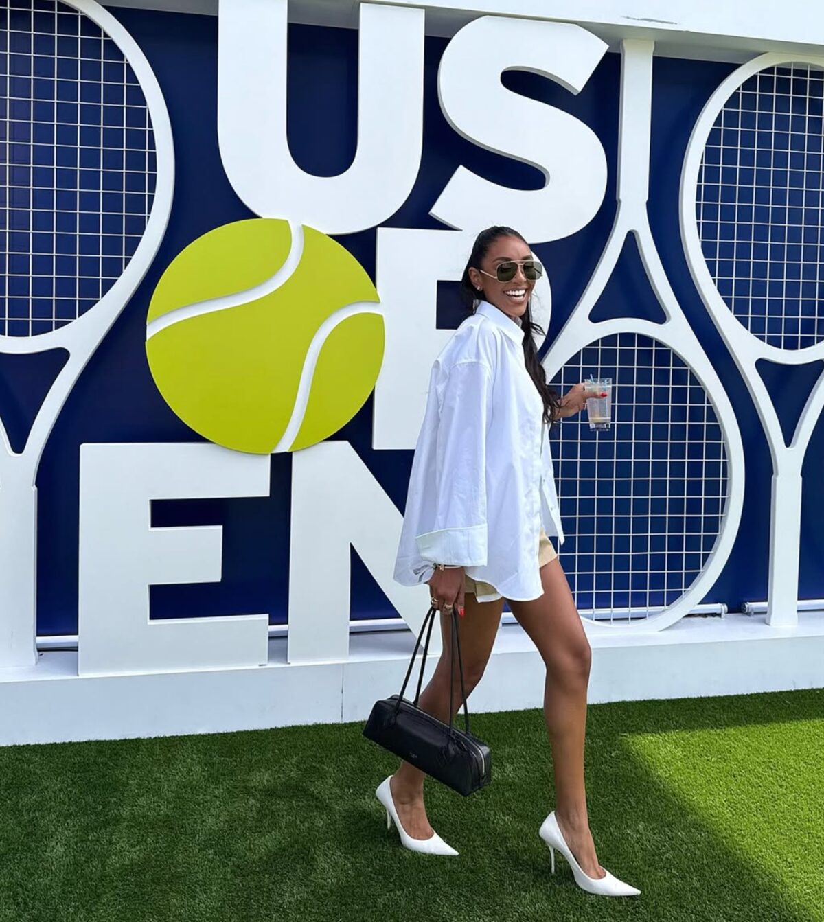 From posing in front of a large photo backdrop to enjoying a cold drink and sitting courtside, Tayshia recapped her experience, writing, “US OPEN DAY 1 🎾”