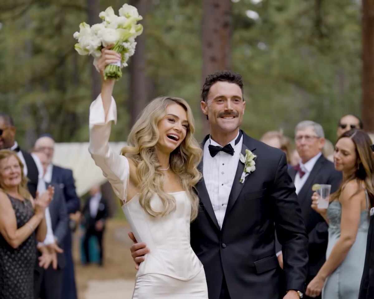 The happy couple shared a highlight video of their special day on social media, which showed the two saying their vows under a draped arch in the woods and enjoying their reception at long tables under the trees.