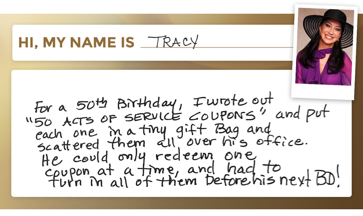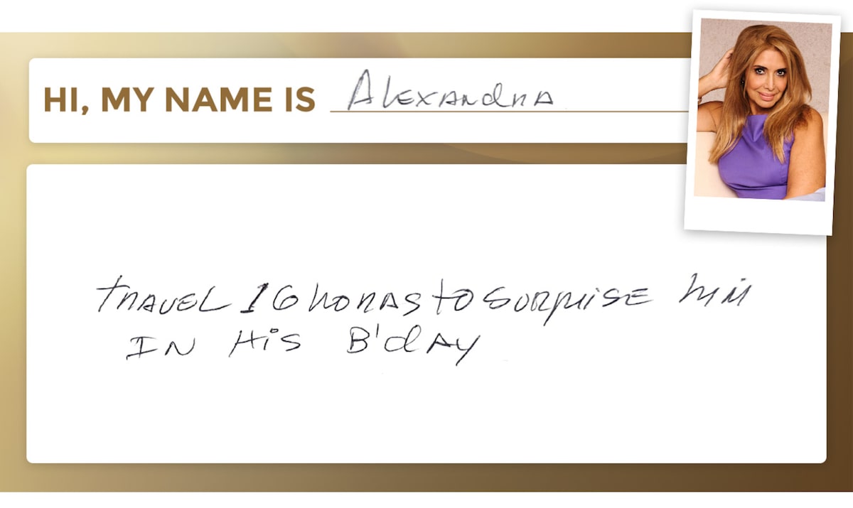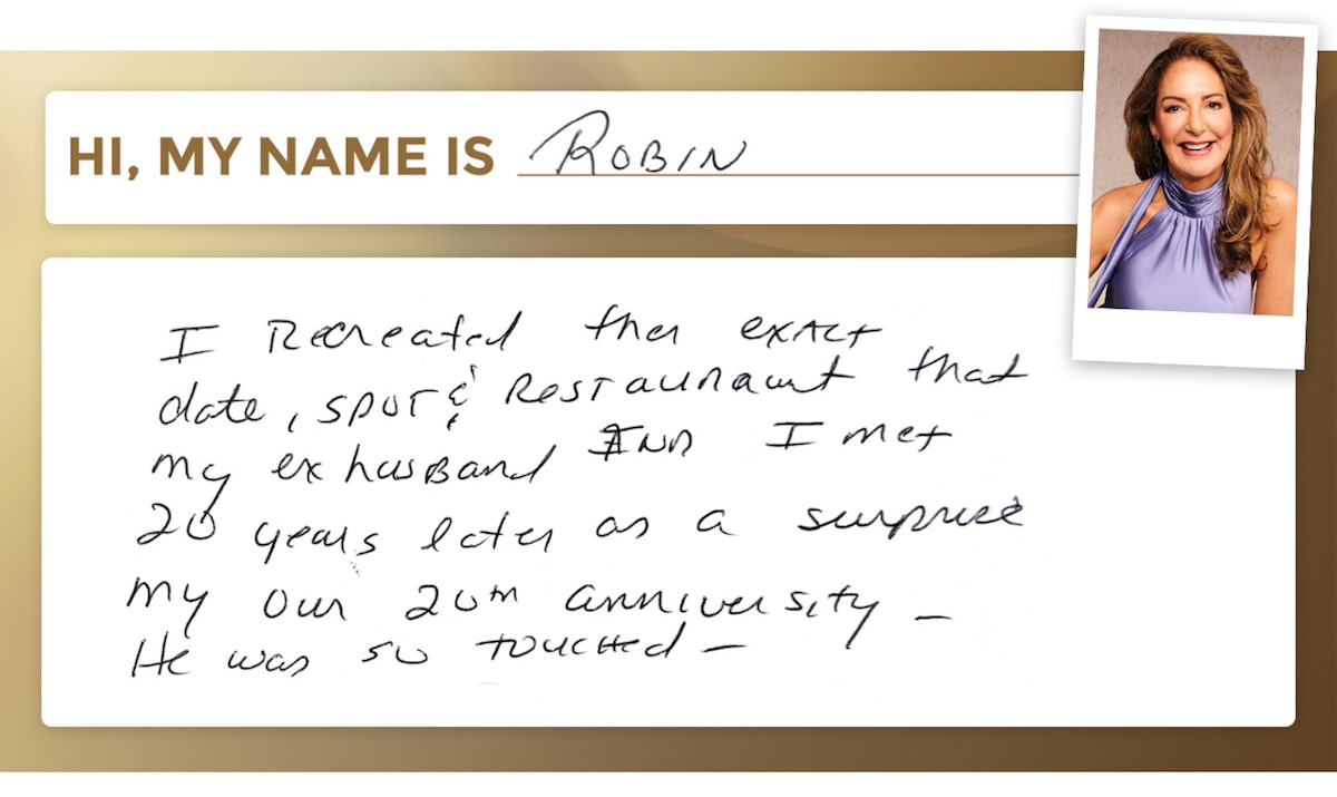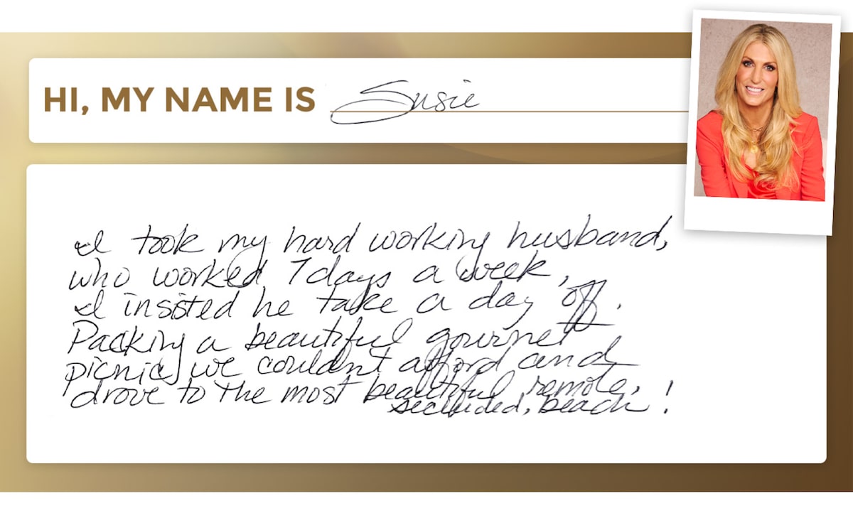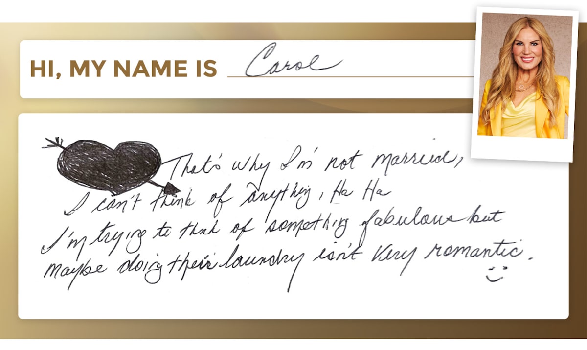 In handwritten notes, contestants Alexandra, Carol, Robin, Susie, and Tracy introduce themselves as they respond to the following prompt: “The most romantic thing I’ve ever done for someone is…”