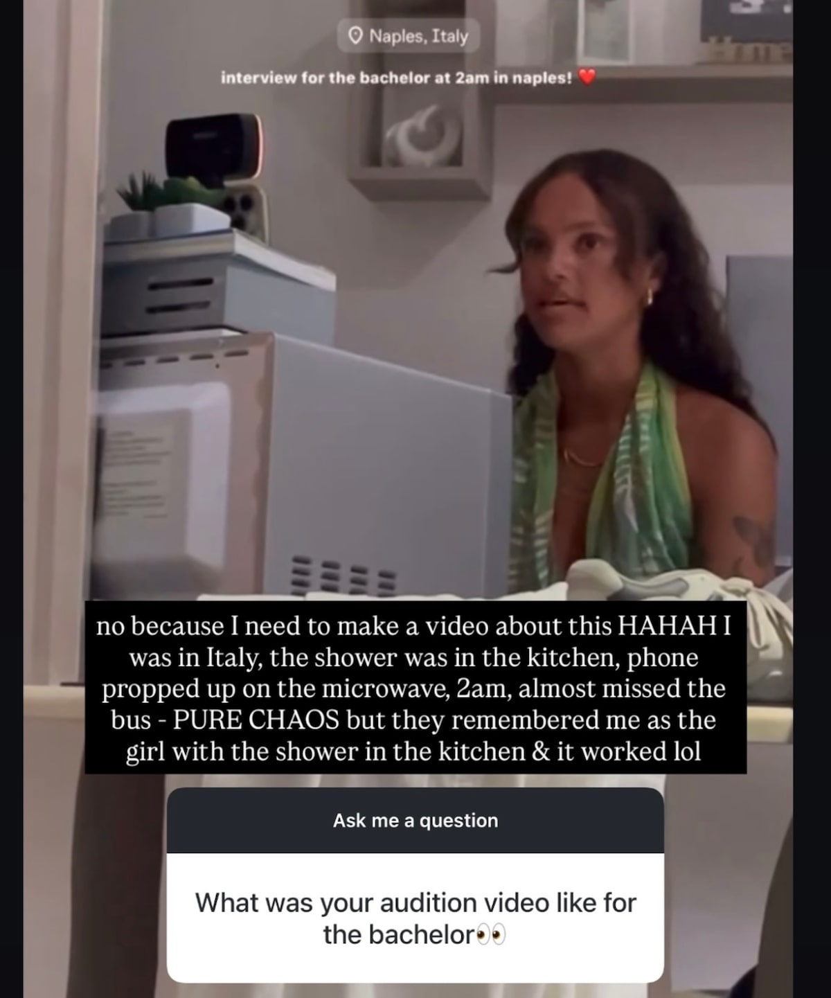 She answered, “I was in Italy, the shower was in the kitchen, phone propped up on the microwave, 2am, almost missed the bus — PURE CHAOS but they remembered me as the girl with the shower in the kitchen & it worked lol.”