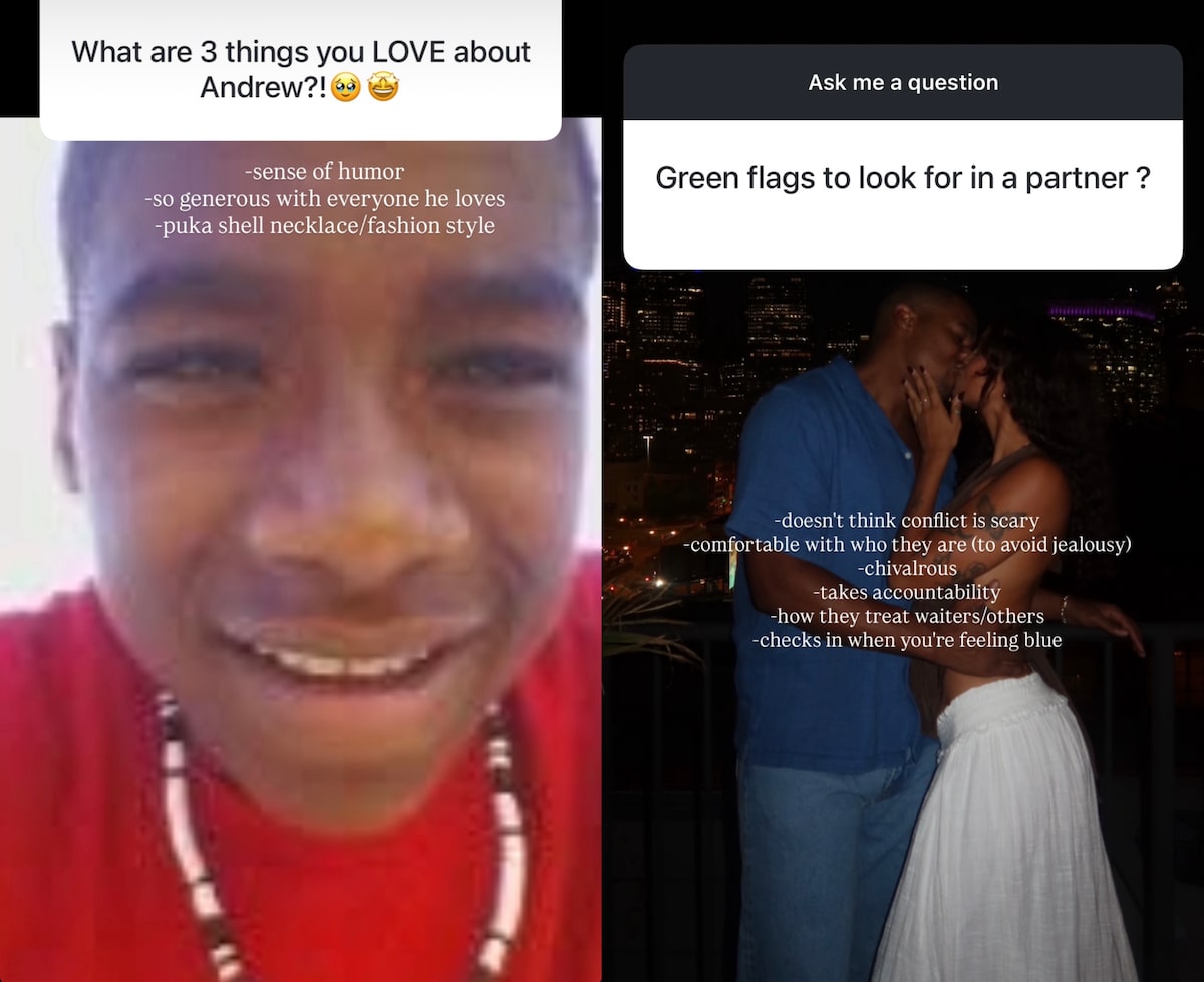 Alexe also shared a glimpse into some of the other qualities she loves about Andrew by highlighting some “green flags” to look for in a partner.