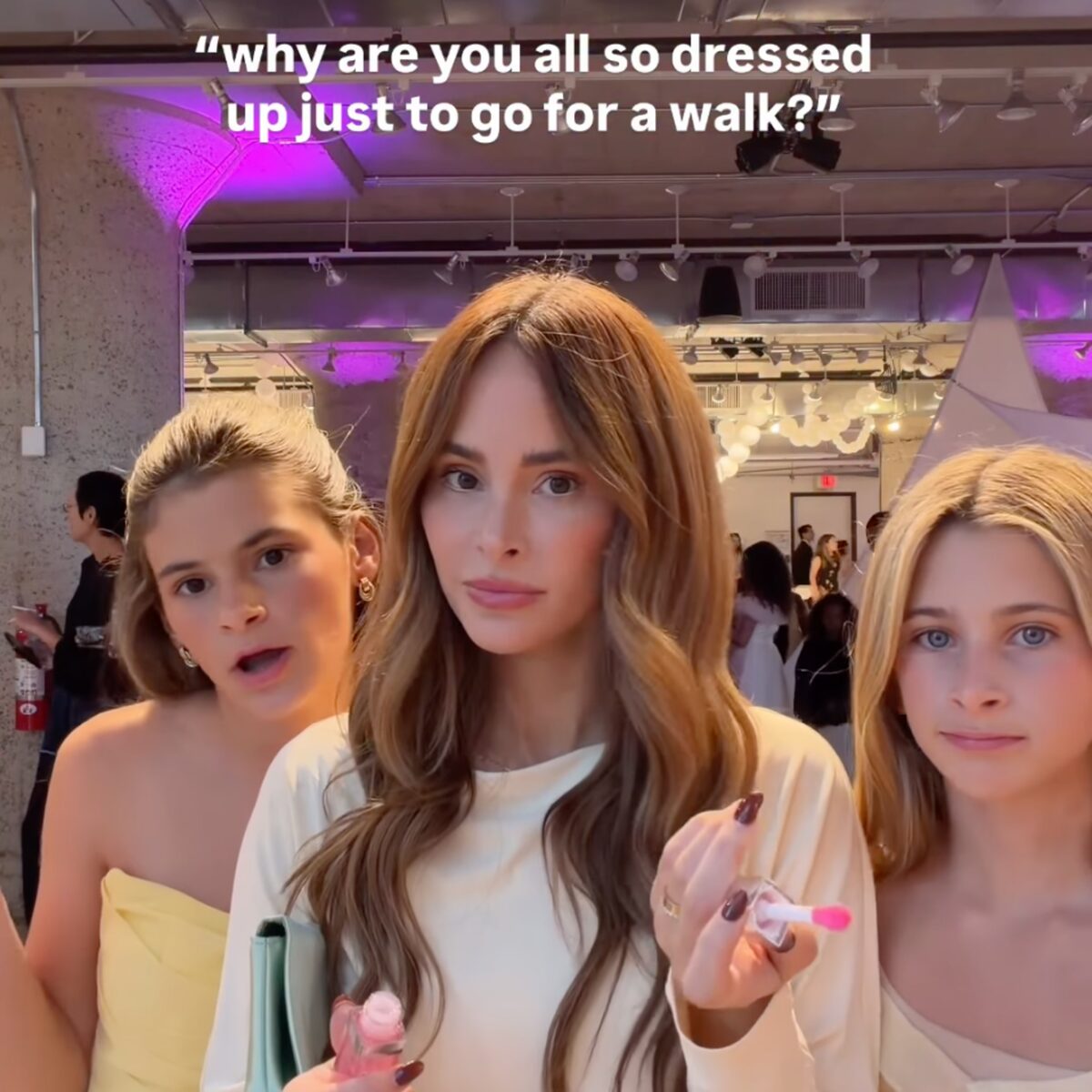In a new video posted online, Amanda is seen putting on lip gloss and standing with her daughters and text reads, “Why are you all so dressed up just to go for a walk?”